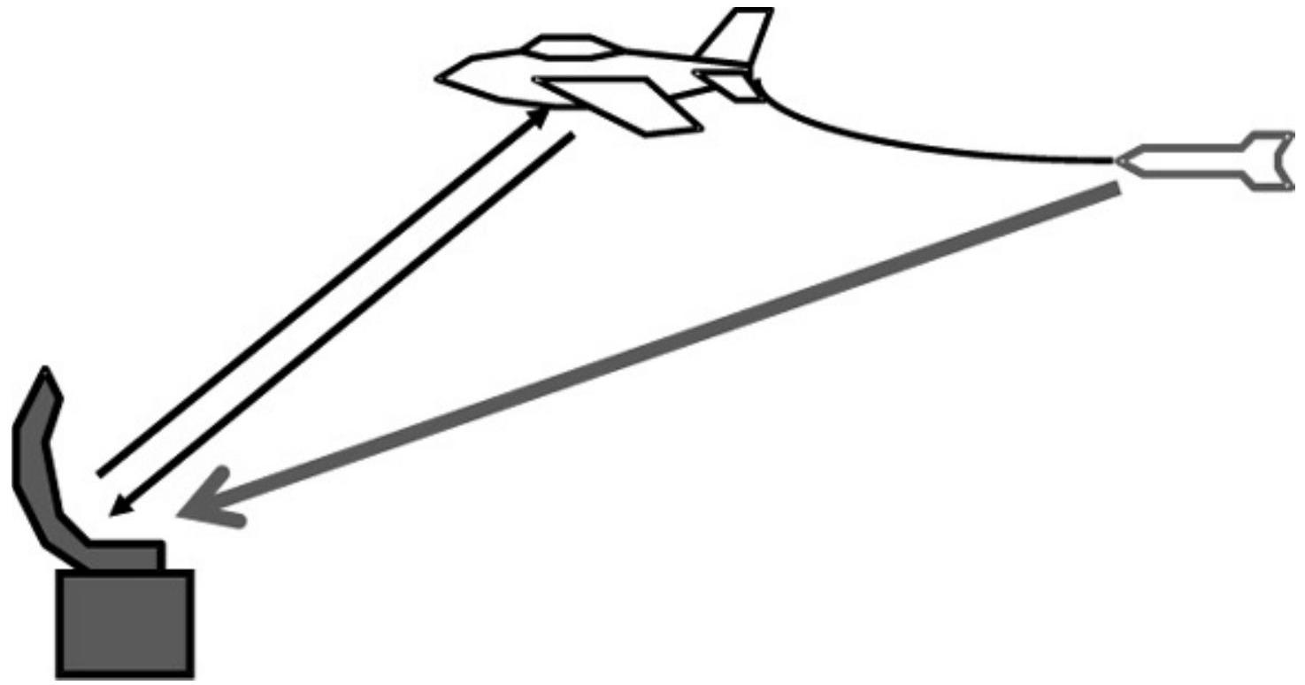 图 10.16 探测诱饵被搜索雷达探测——雷达将目标交给尚未激活的跟踪雷达。这会使跟踪雷达发射信号,从而可以被探测和攻击。