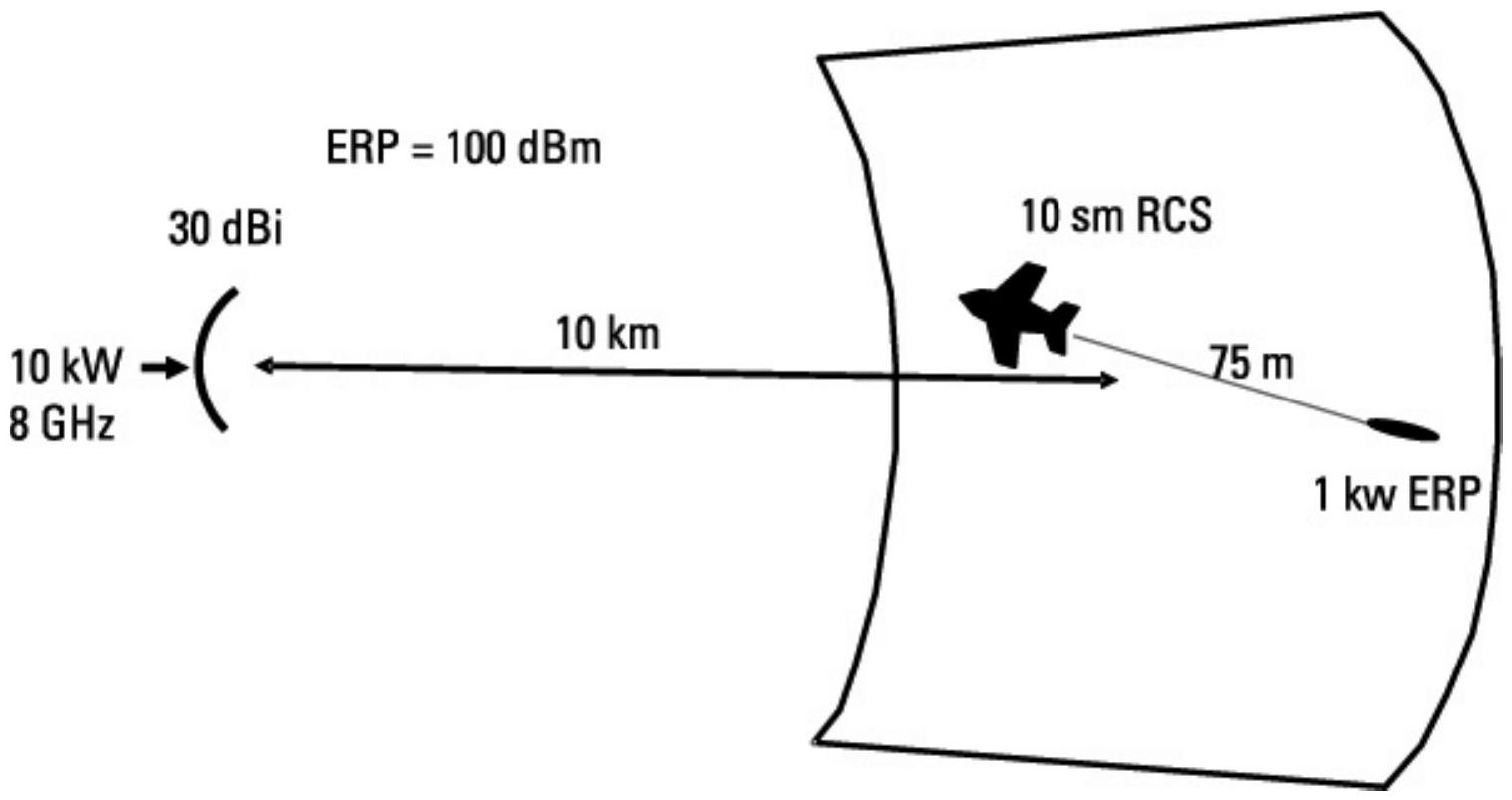 图 10.40 一台 1 kW ERP 的拖曳诱饵,位于距 100 dBm、8 GHz 雷达 10 km 处,将产生 \(125{,}893\text{ m}^2\) 的有效 RCS。