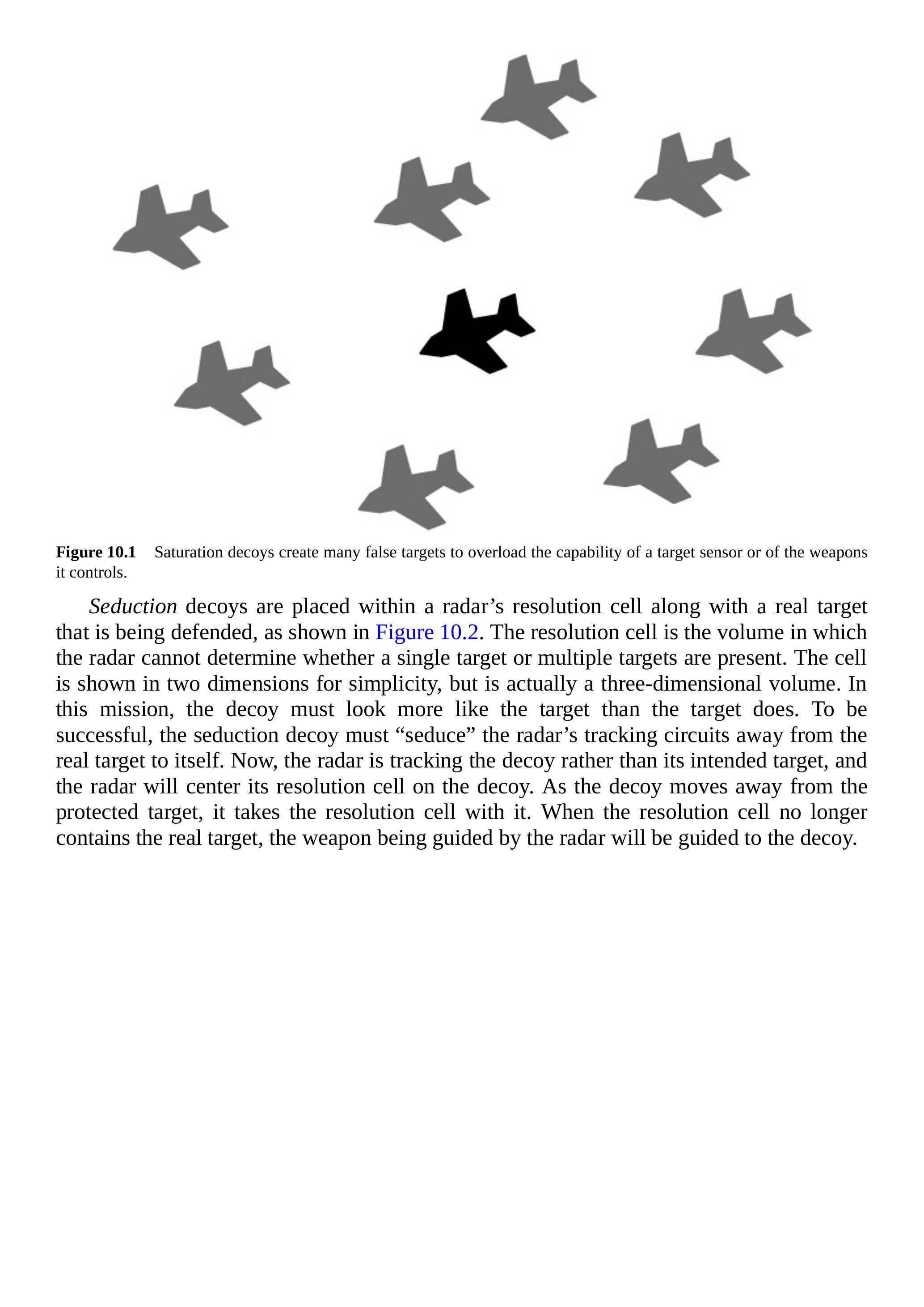 图 10.1 饱和诱饵产生大量虚假目标,以超载目标传感器或其控制的武器的能力。