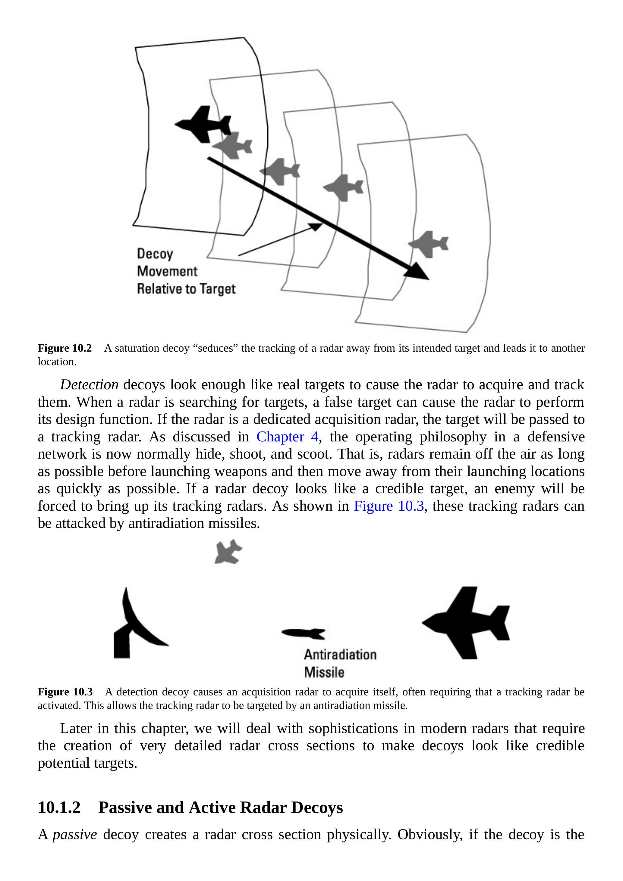 雷达诱饵的三个基本任务如表 10.1 所示:饱和(saturation)、诱导(seduction)和探测(detection)。