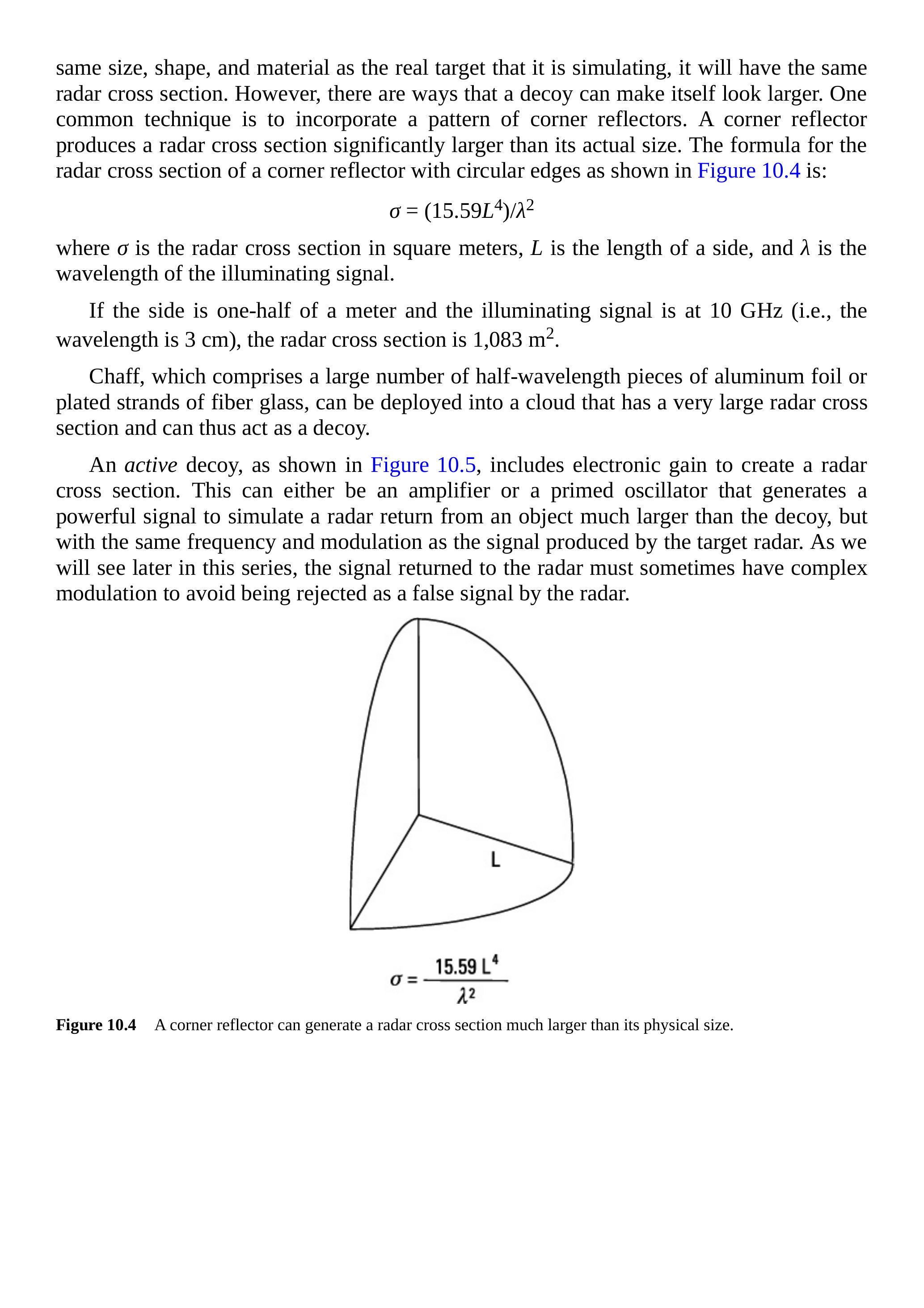 被动诱饵通过物理方式产生雷达截面。显然,如果诱饵与其模拟的真实目标在尺寸、形状和材料上相同,它将具有相同的雷达截面。然而,诱饵也有方法让自己看起来更大。一种常见技术是结合角反射器阵列。角反射器产生的雷达截面明显大于其实际尺寸。具有圆形边缘的角反射器的雷达截面公式如图 10.4 所示: