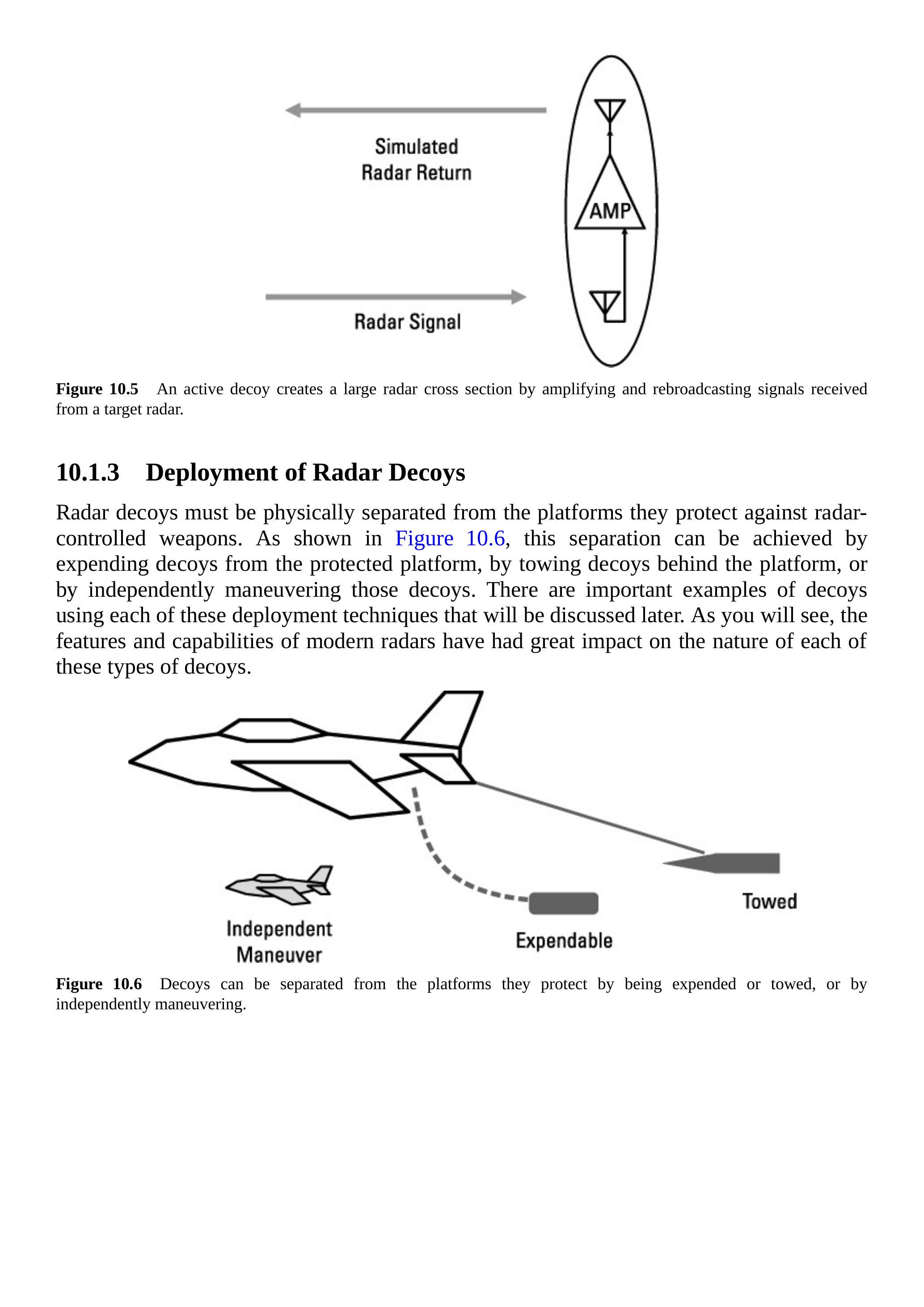 雷达诱饵必须与其保护的平台在物理上分离,以防雷达制导武器攻击。如图 10.6 所示,这种分离可以通过从被保护平台释放诱饵、在平台后方拖曳诱饵,或使诱饵独立机动来实现。后续将讨论每种部署技术的重要诱饵实例。正如你所看到的,现代雷达的特性和能力对每种类型的诱饵都有重大影响。