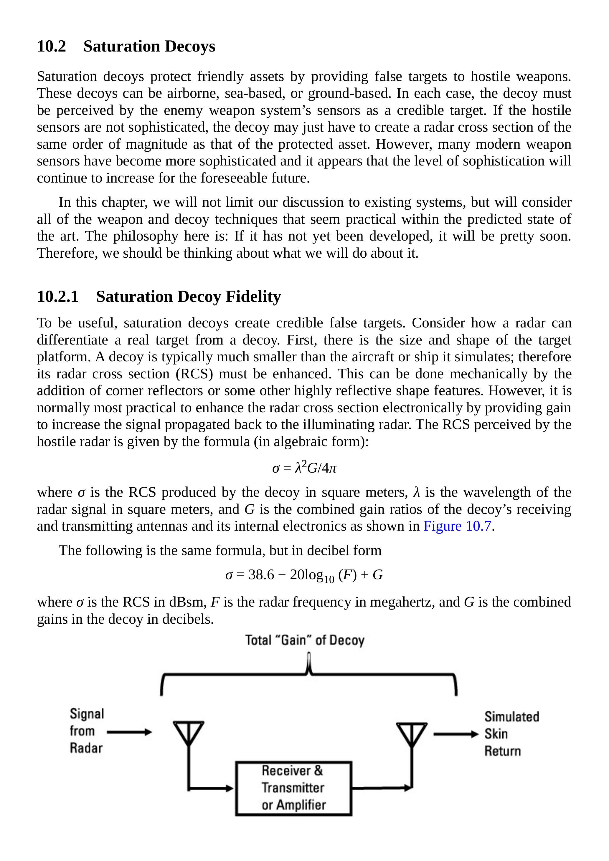 为了有用,饱和诱饵必须创造出可信的虚假目标。考虑雷达如何区分真实目标与诱饵。首先是目标平台的尺寸和形状。诱饵通常比其模拟的飞机或舰船小得多,因此必须增强其雷达截面(RCS)。这可以通过增加角反射器或其他高反射形状特征来机械实现。然而,通常最实用的方法是通过电子方式增强雷达截面,即提供增益以增加返回照射雷达的信号。敌方雷达感知的 RCS 由以下公式给出(代数形式):
