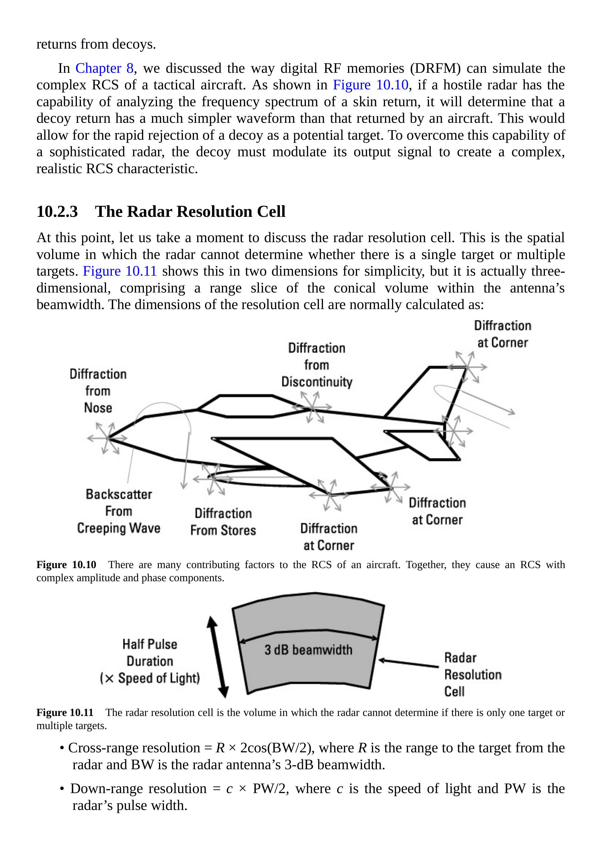 图 10.38 显示了攻击雷达的分辨单元,以及使用啁啾或 Barker 码脉冲压缩后的分辨单元有效区域。分辨单元和脉冲压缩在第 4 章中有详细讨论。这里的重点是,拖曳飞机和诱饵都必须位于分辨单元内(如果存在压缩,则包括压缩区域)才能发挥作用。