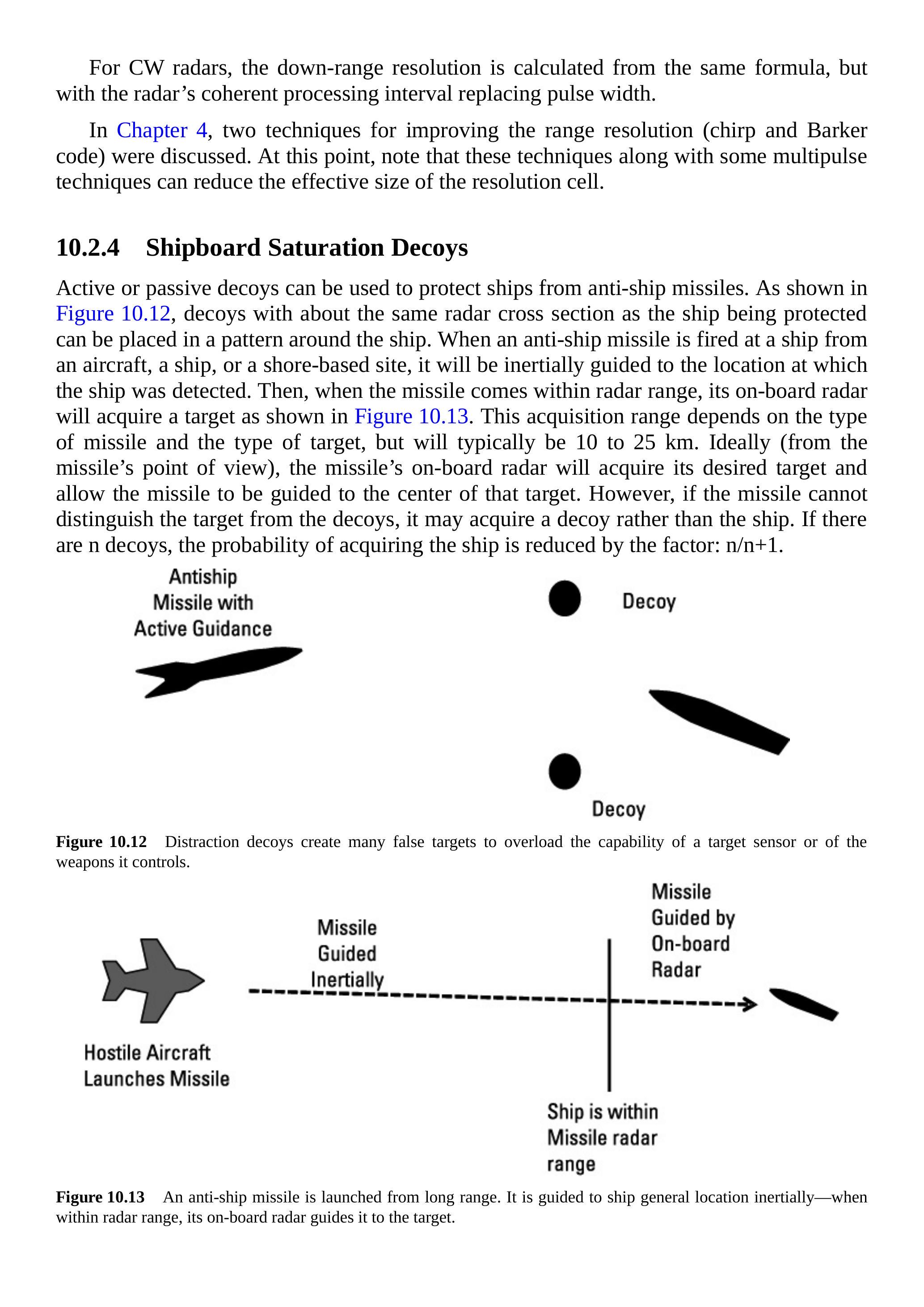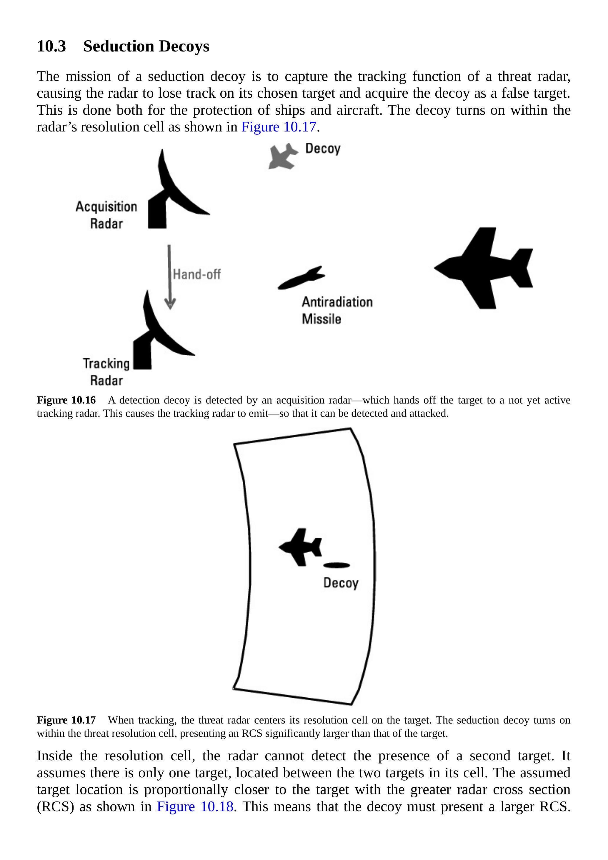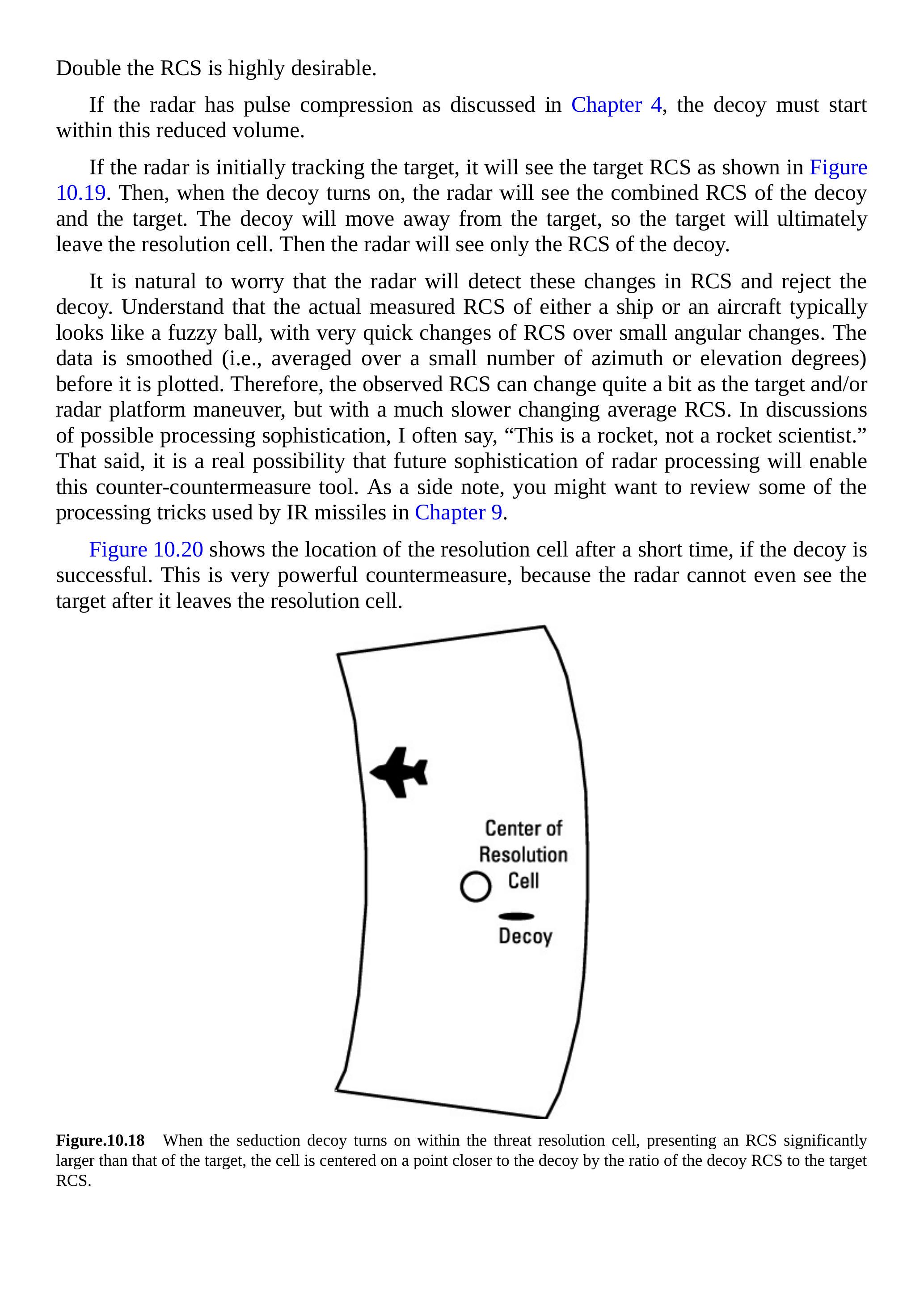 RCS 加倍是非常理想的。 如果雷达具有第 4 章中讨论的脉冲压缩功能,则诱饵必须在此缩小的体积内启动。