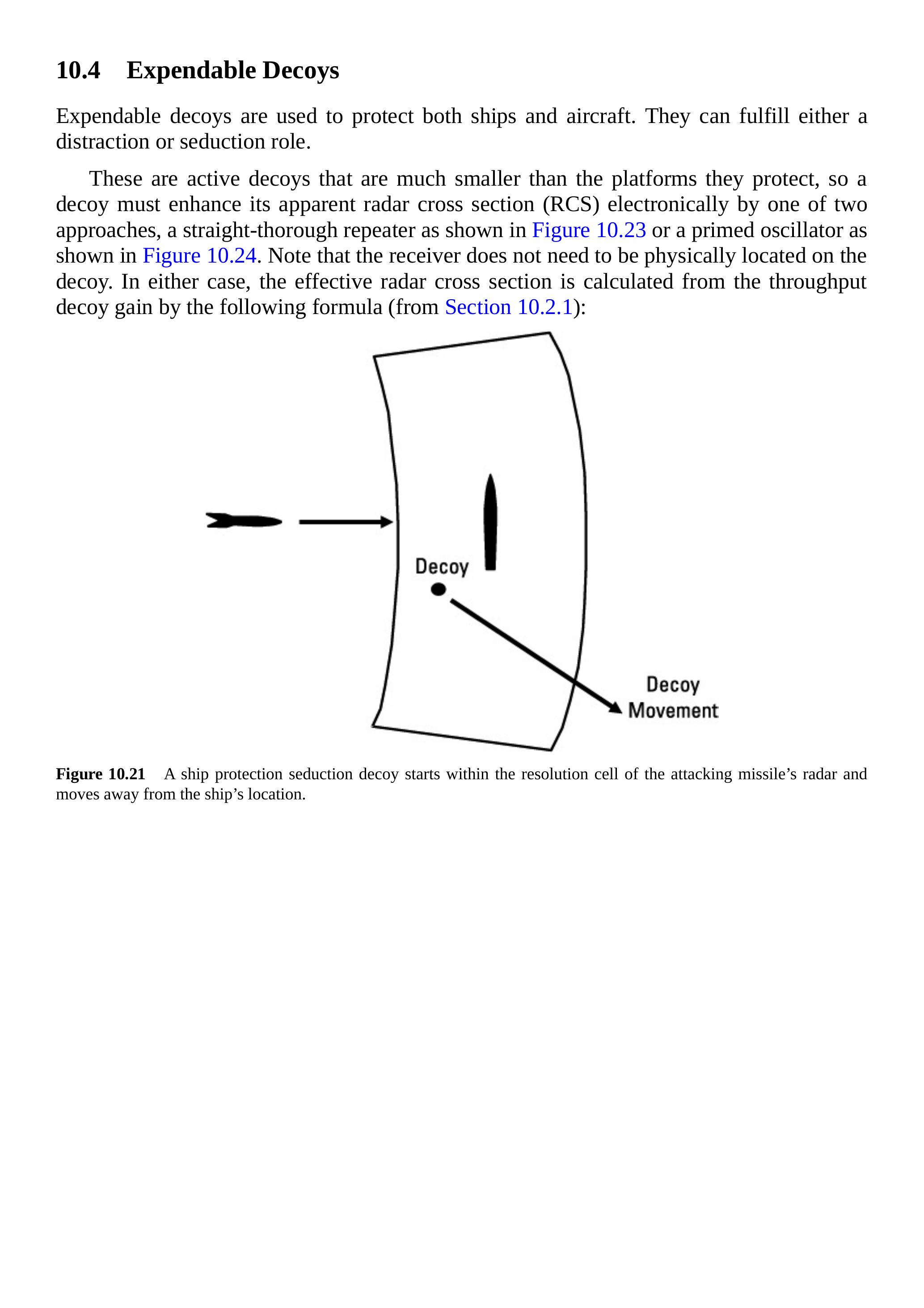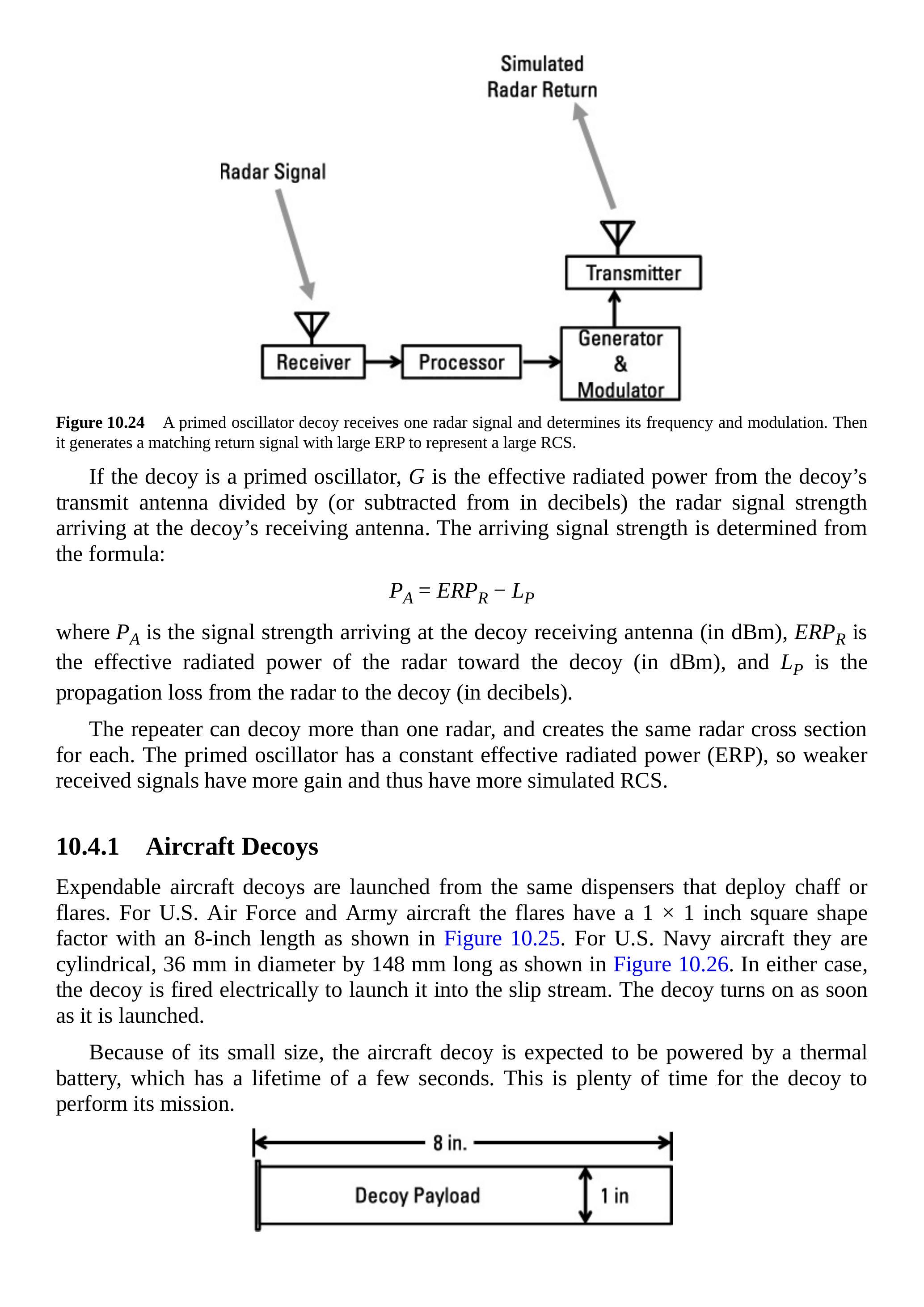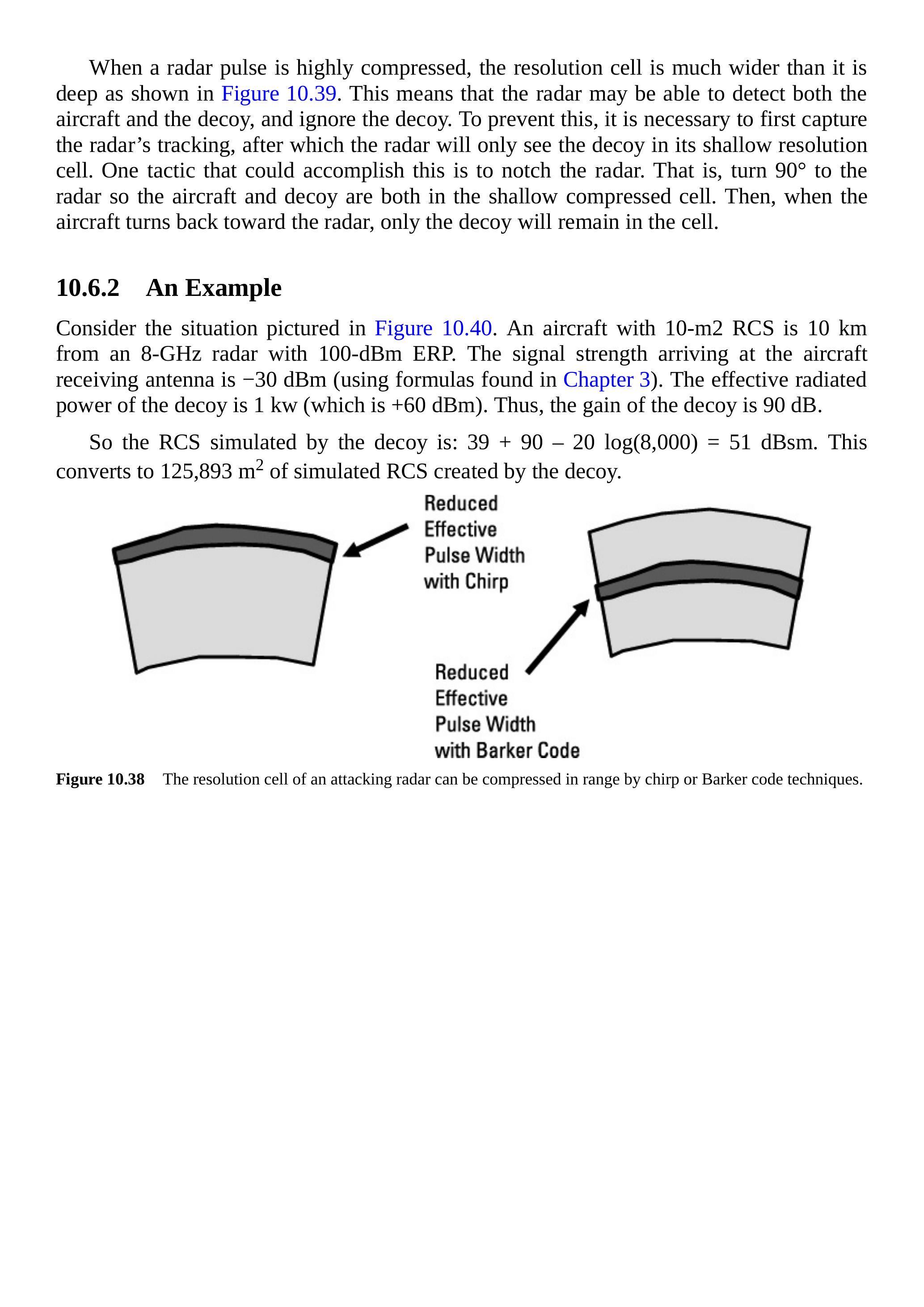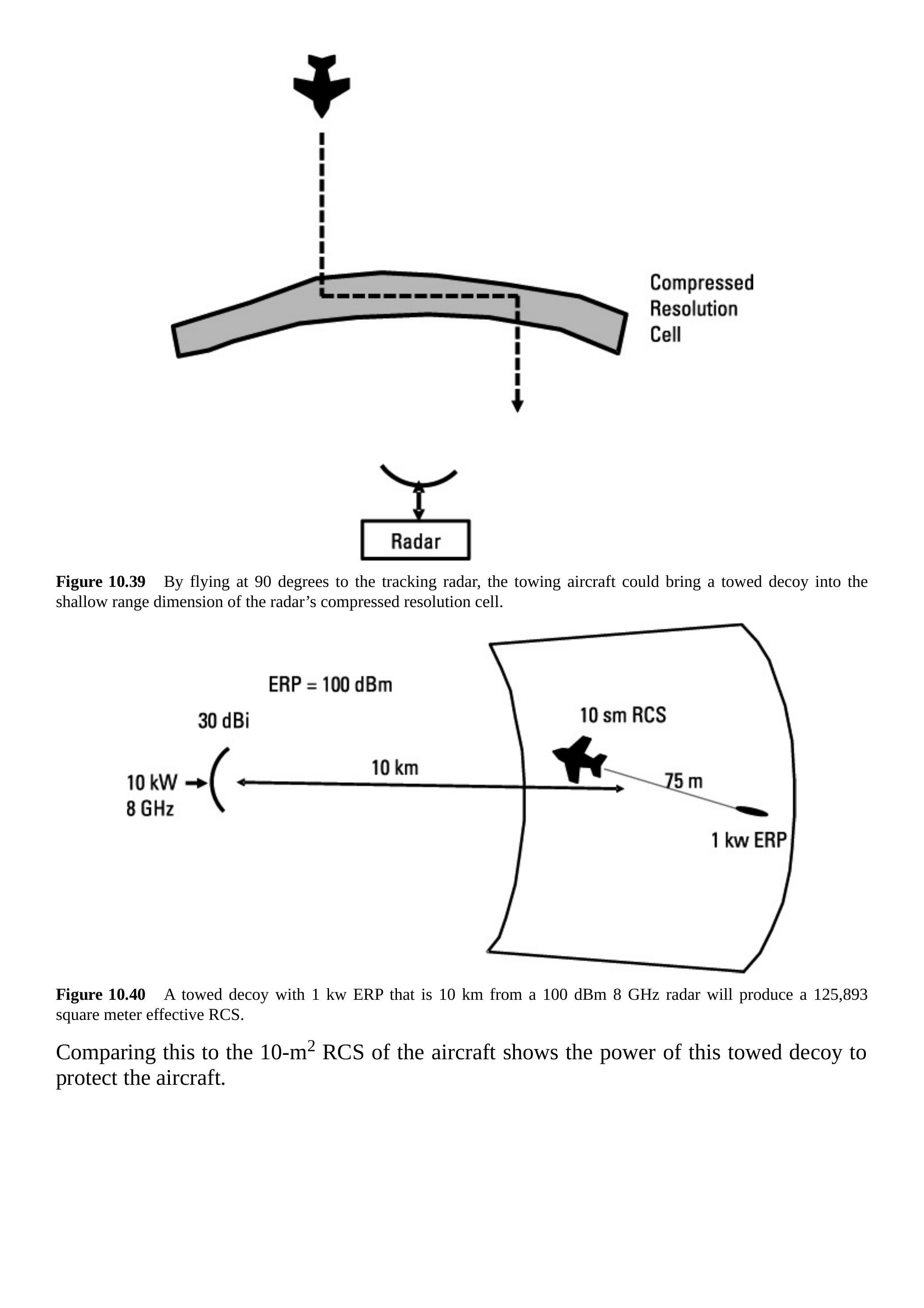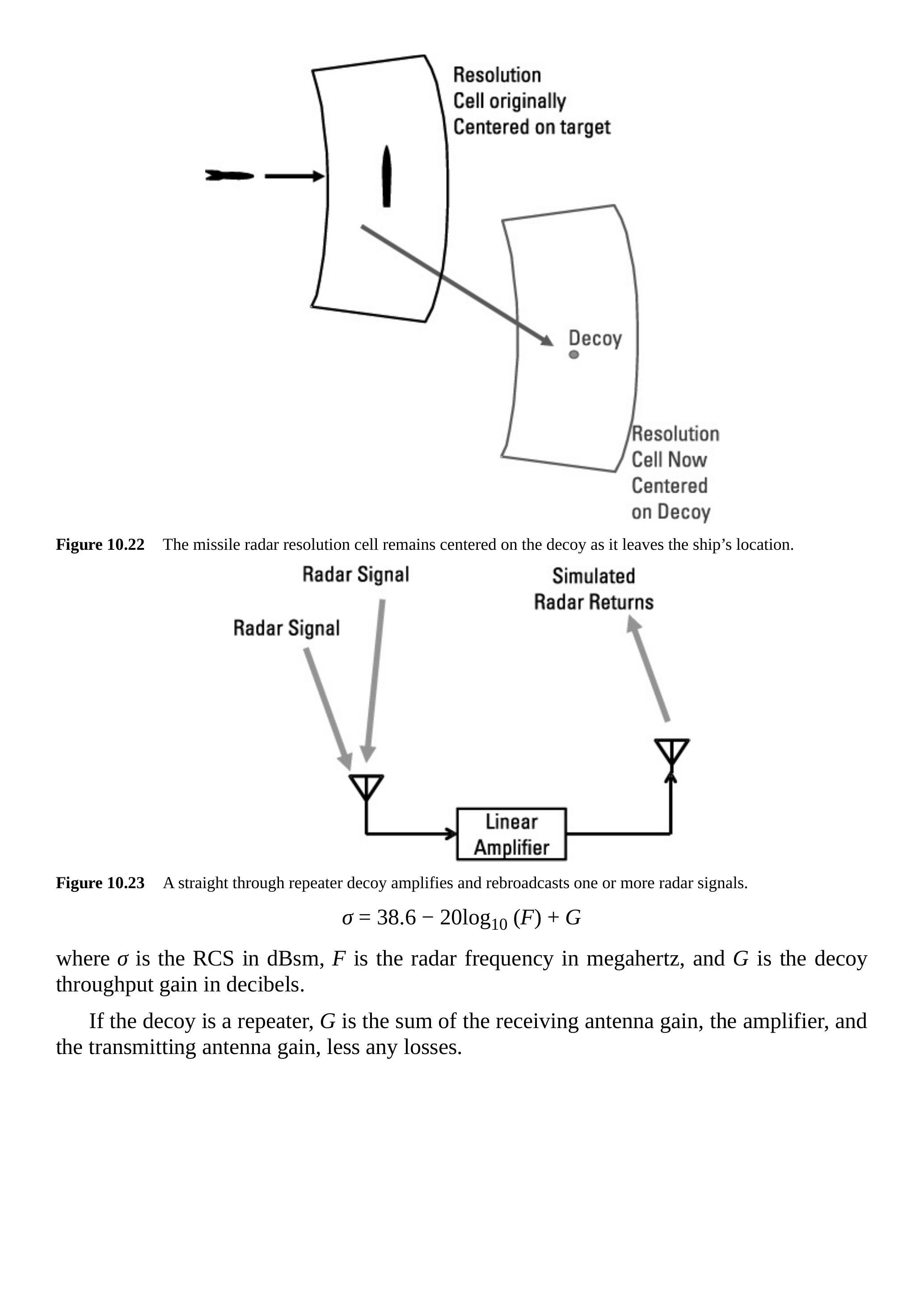 图 10.37 显示了与威胁雷达的交战情形。飞机和诱饵在攻击雷达看来是单一目标。雷达信号在飞机上接收并分析,诱饵发射的模拟表面回波信号功率足够大,产生远大于飞机的 RCS。使用公式: