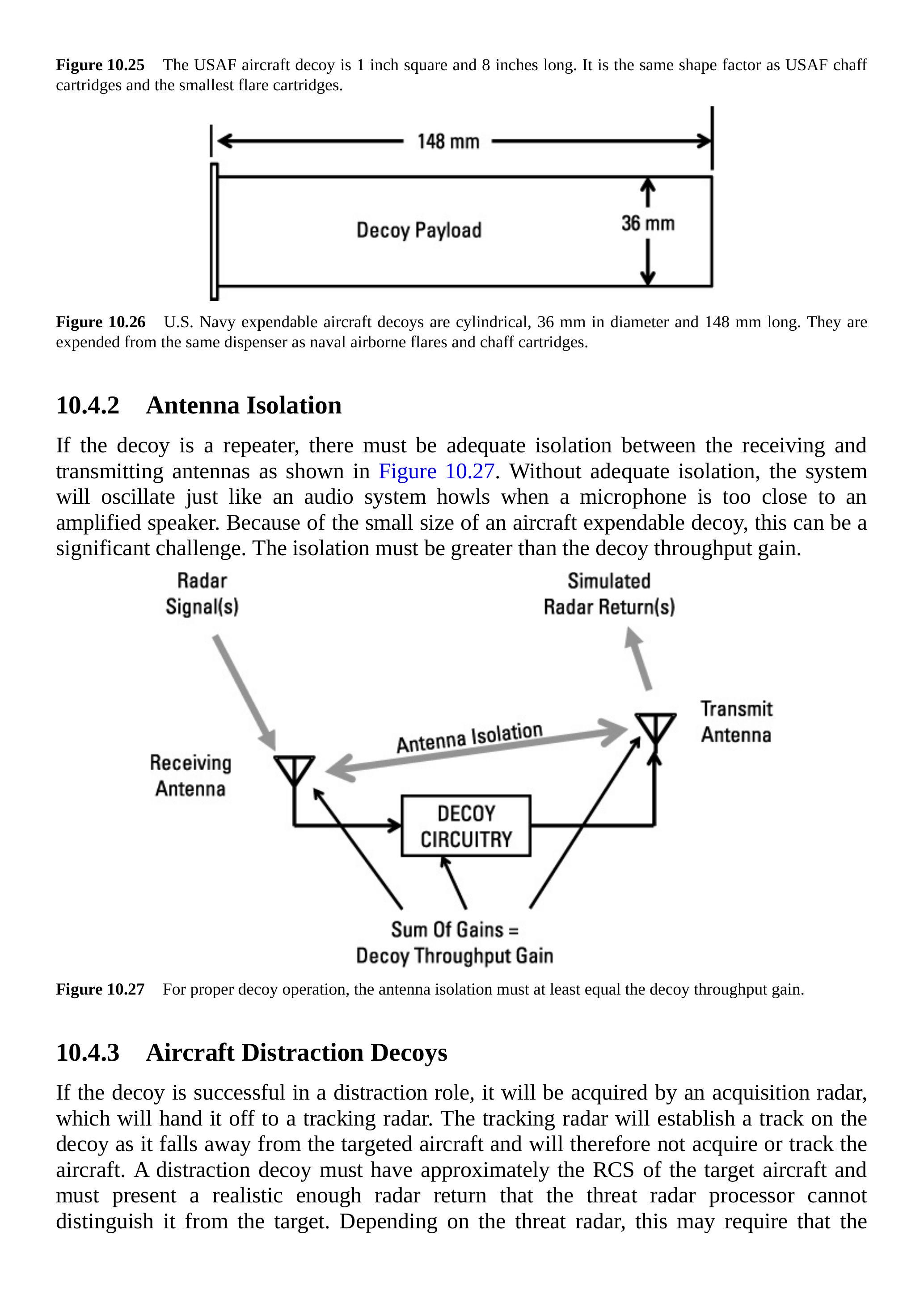 如果诱饵是中继器,则接收天线和发射天线之间必须具有足够的隔离,如图 10.27 所示。没有足够的隔离,系统将产生振荡,就像音响系统中麦克风靠近放大扬声器时会发出啸叫一样。由于飞机一次性诱饵体积小,这可能是一个显著的挑战。天线隔离必须大于诱饵增益。