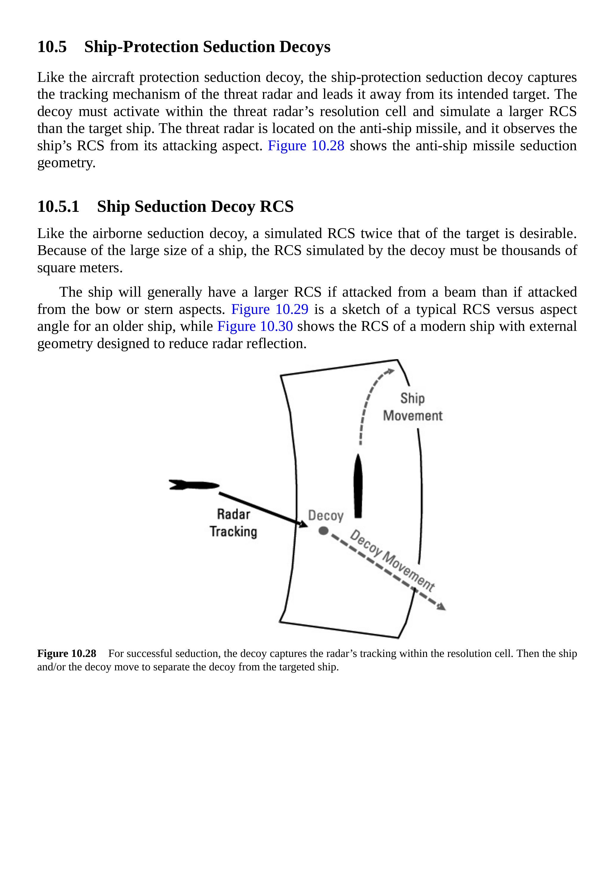 与飞机保护诱导诱饵类似,舰船保护诱导诱饵捕获威胁雷达的跟踪机制,并将其引离预定目标。诱饵必须在威胁雷达的分辨单元内启动,并模拟比目标舰船更大的 RCS。威胁雷达位于反舰导弹上,从攻击角度观测舰船的 RCS。图 10.28 显示了反舰导弹的诱导几何结构。