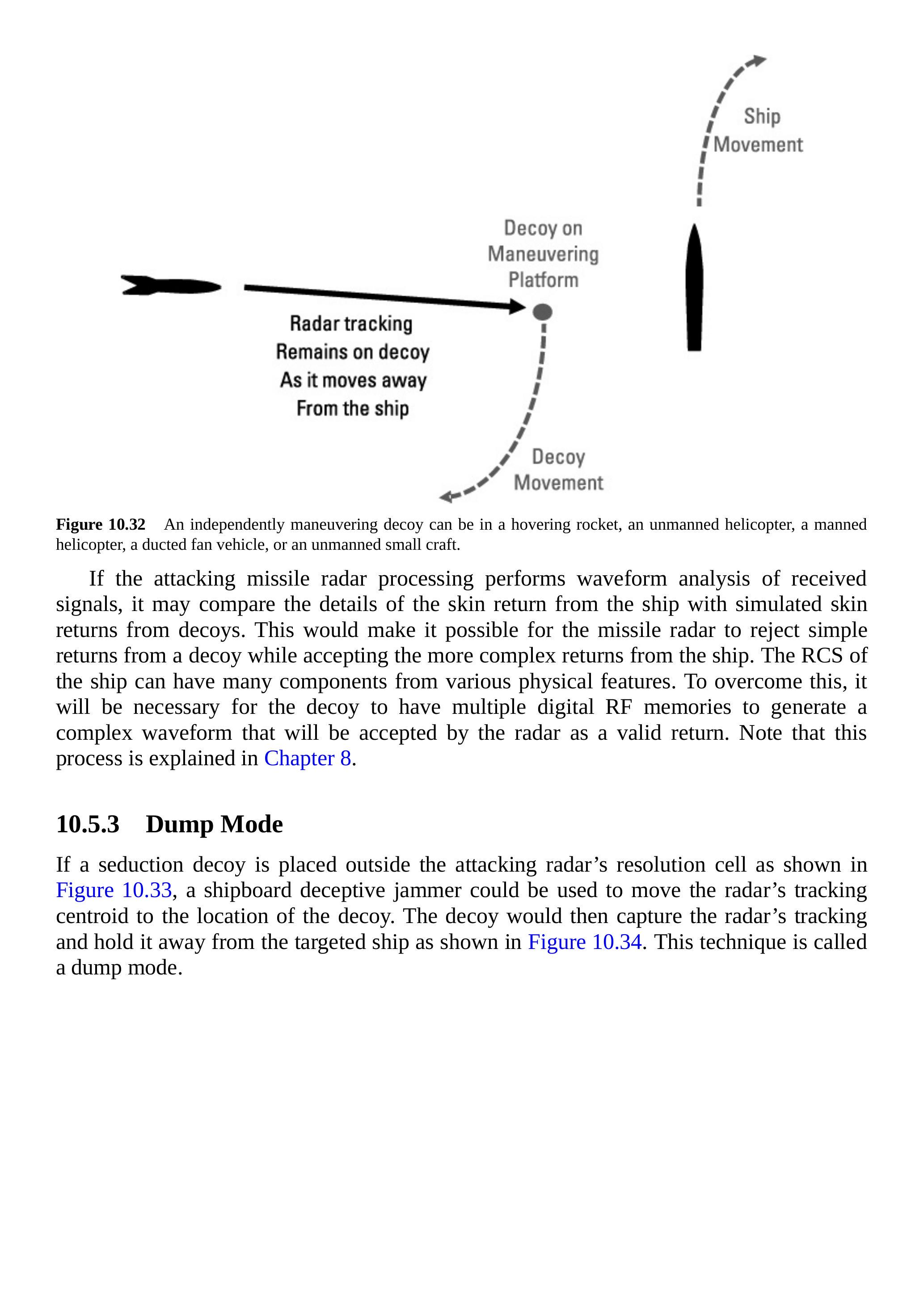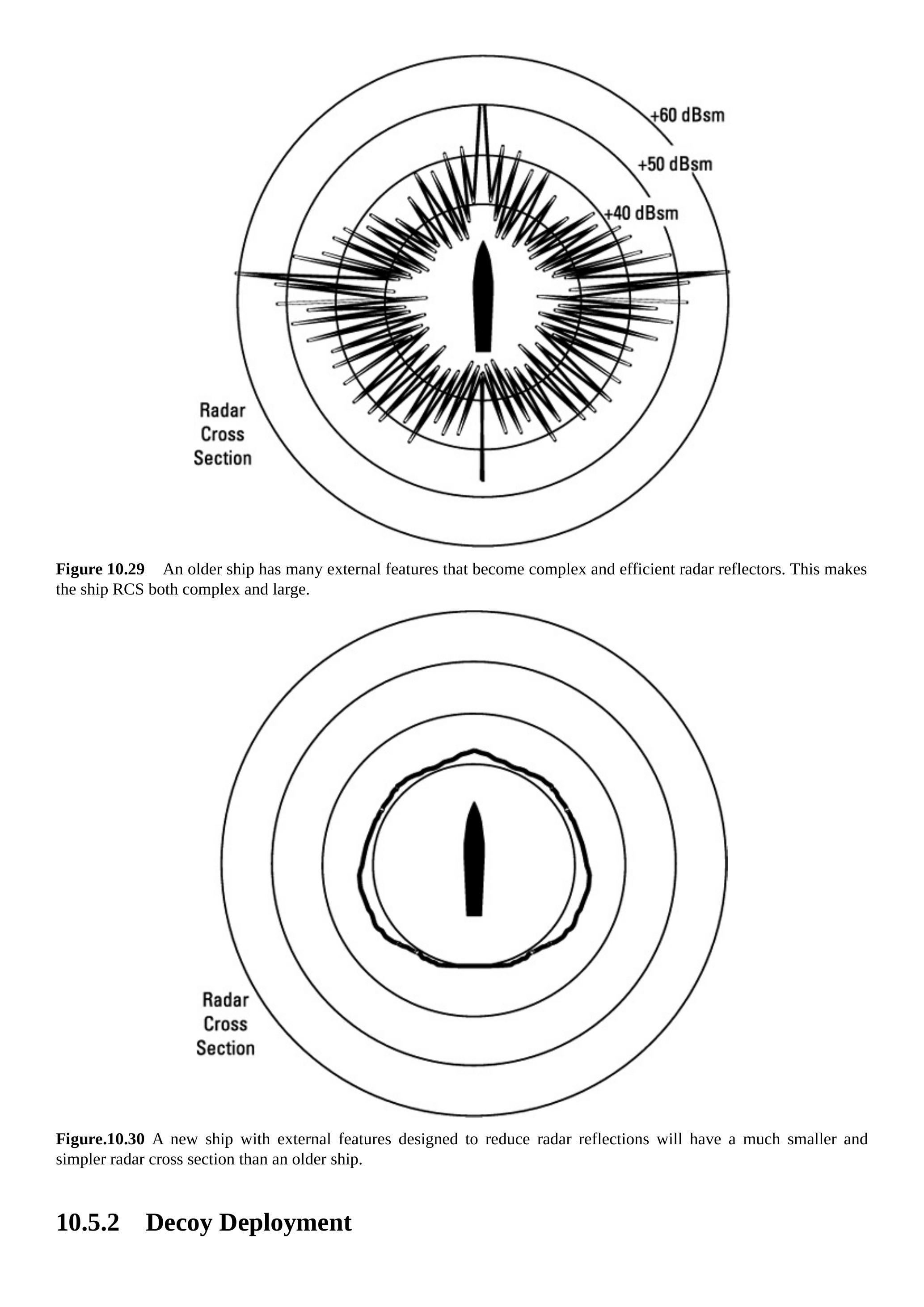 如果攻击导弹雷达处理执行接收信号的波形分析,它可能会将舰船表面回波的细节与诱饵模拟的表面回波进行比较。这可能使导弹雷达拒绝简单的诱饵回波,同时接受舰船更复杂的回波。舰船的 RCS 可能包含来自各种物理特征的多个分量。为克服这一点,诱饵需要具备多个数字射频存储器,以生成复杂的波形,使雷达接受其为有效回波。需要注意的是,这一过程在第 8 章中有详细说明。
