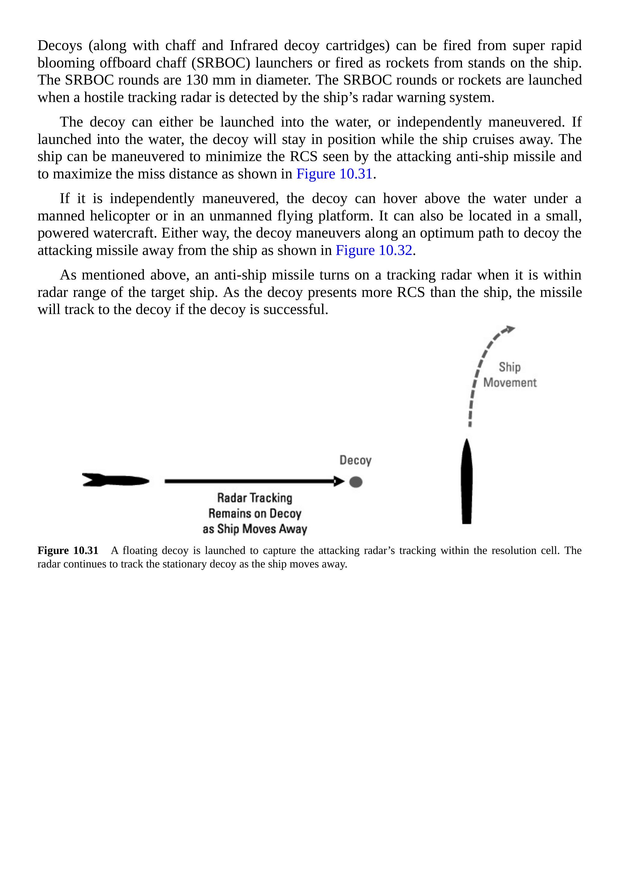 如果诱饵进行独立机动,它可以悬停在有人直升机或无人飞行平台上方,也可以放置在小型动力水上平台上。无论哪种方式,诱饵沿最佳路径机动,将攻击导弹引离舰船,如图 10.32 所示。