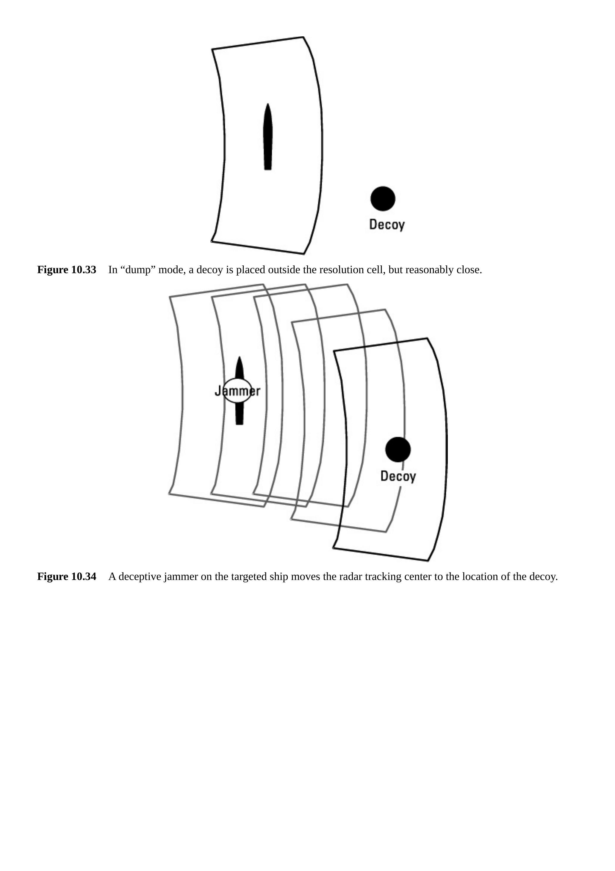图 10.28 为实现有效诱导,诱饵在雷达分辨单元内捕获雷达跟踪。然后舰船和/或诱饵移动,将诱饵与目标舰船分开。