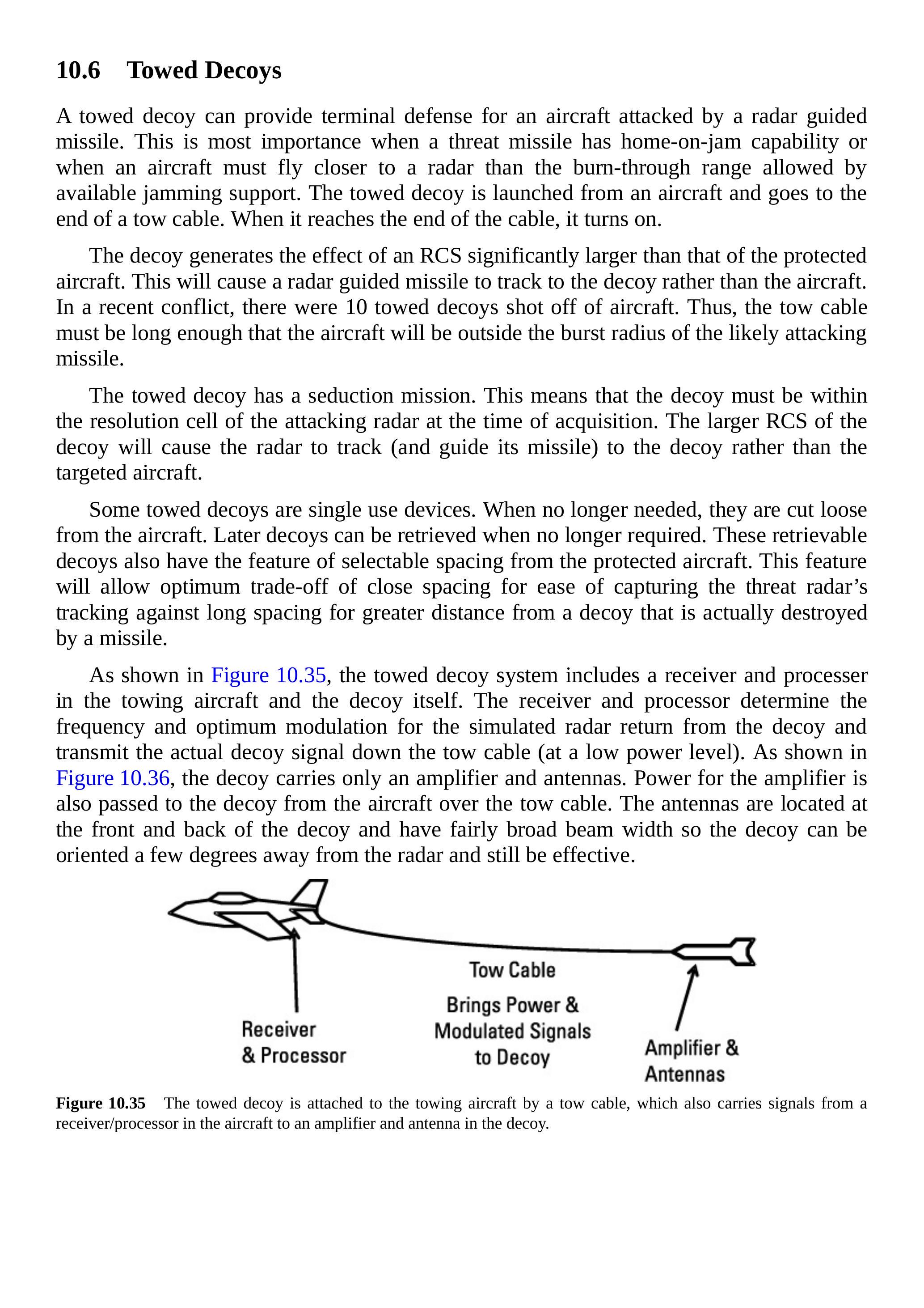 如图 10.35 所示,拖曳诱饵系统包括拖曳飞机上的接收机与处理器以及诱饵本身。接收机和处理器确定诱饵模拟雷达回波的频率和最佳调制,并通过拖曳索(低功率)传输实际诱饵信号。如图 10.36 所示,诱饵仅携带放大器和天线。放大器的电源也通过拖曳索从飞机提供。天线位于诱饵前后,具有较宽波束宽度,因此诱饵即使偏离雷达几度仍能有效工作。