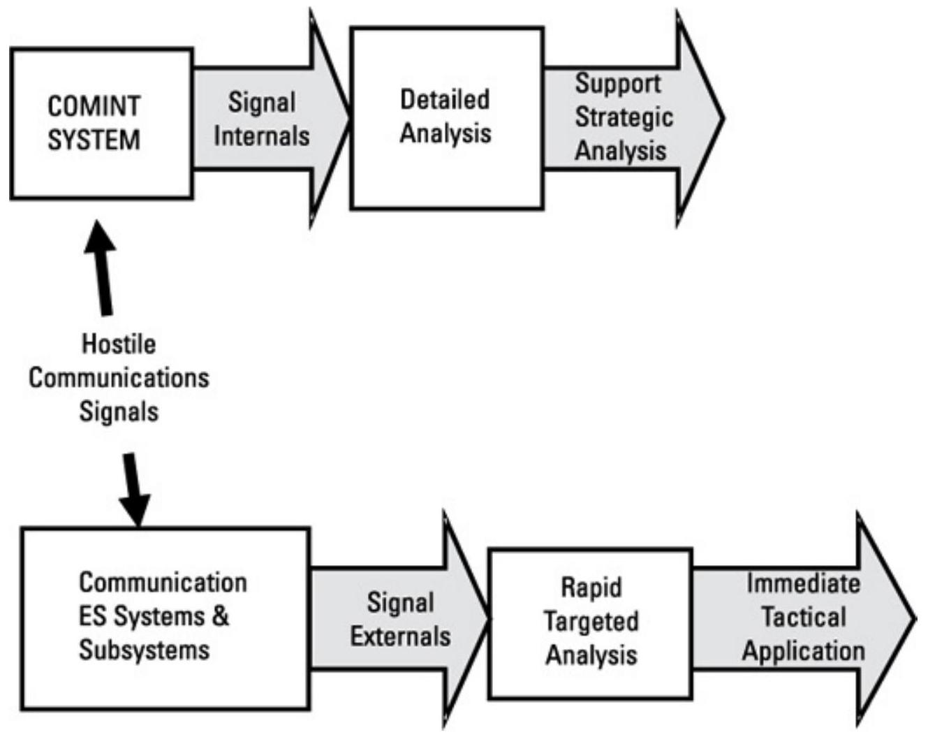图 11.3 COMINT 经典上处理信号内部内容以支持战略行动;通信 ES 处理信号外部特性以支持即时战术决策。