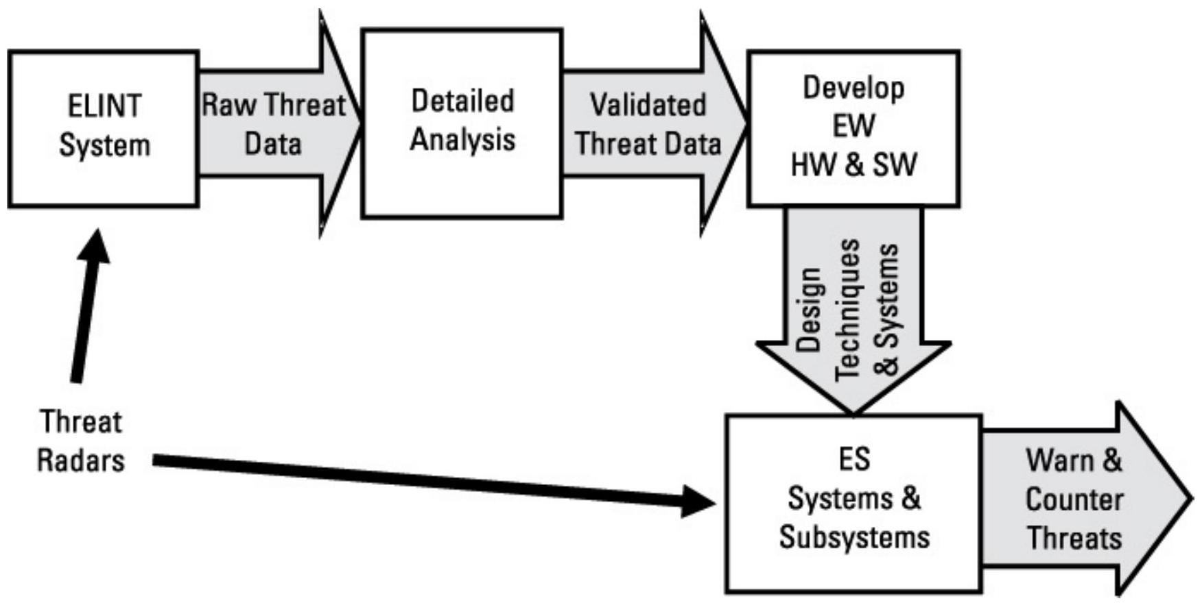 图 11.4 ELINT 系统收集威胁数据,以支持 ES 系统及其子系统的发展,用于威胁预警和对策选择。