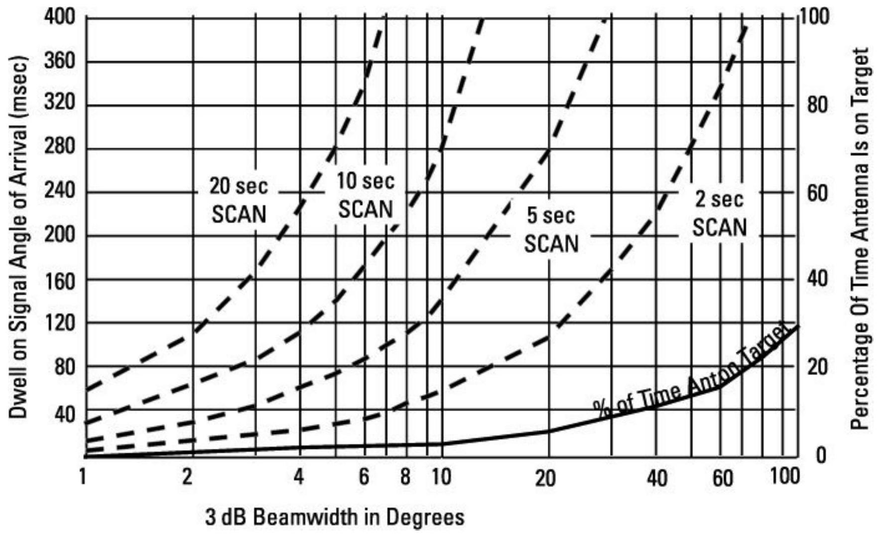如图 11.6 所示,波束宽度决定了天线覆盖的可能入射角百分比。使用图中的这部分时,从波束宽度向上画一条直线到实线,然后向右画到右侧纵坐标值。这只考虑了一个搜索维度(例如方位搜索);二维搜索则要困难得多。在同一图中,扫描天线在信号入射角(仅方位)上的停留时间显示为各种圆形扫描周期下的波束宽度函数。使用图中这部分时,从波束宽度向上画直线到所选扫描周期的虚线,再向左画到左侧纵坐标值。需要注意的是,在天线指向每个可能入射角期间,必须进行频率搜索。天线波束越窄,为允许频率搜索,接收天线的扫描速度就必须越慢。因此,寻找未知频率和入射角的感兴趣信号所需的时间会更长。频率搜索将在第 11.5 节的接收机类型上下文中讨论。