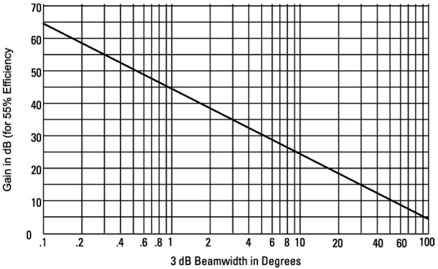 如图 11.7 所示,天线半功率(\(3-\mathrm{dB}\))波束宽度与天线增益之间存在权衡关系。此图针对 \(55\%\) 效率的抛物面天线,但这种权衡适用于所有类型的窄波束天线。接收天线增益是拦截敌方信号距离的重要考虑因素,如下文所述。