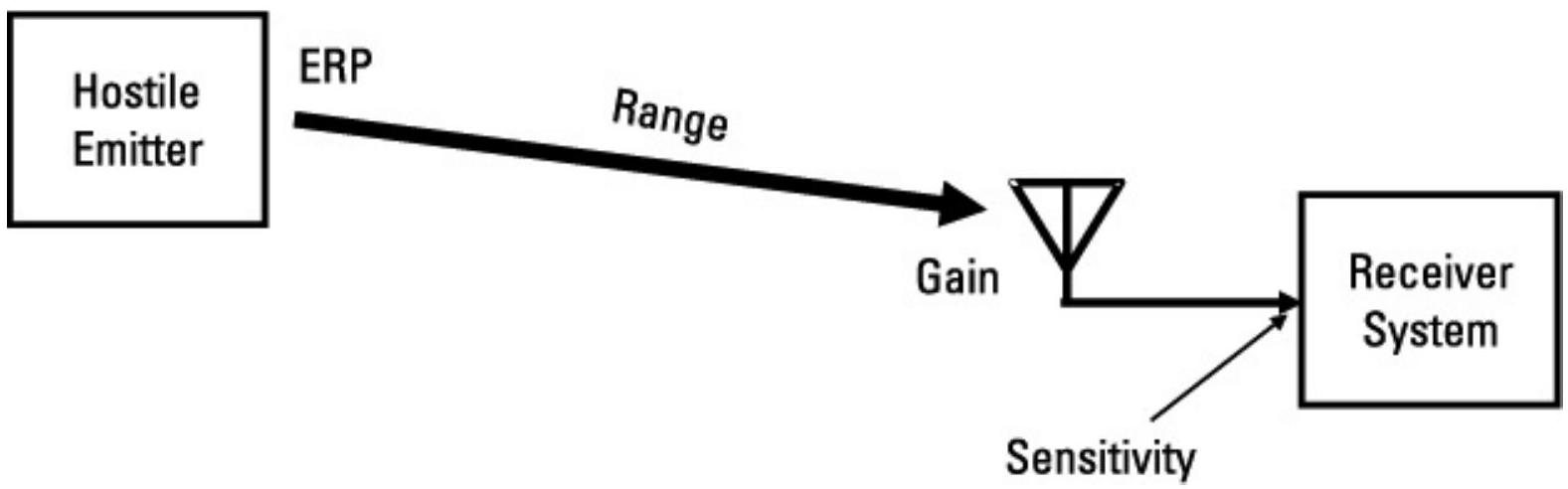 图 11.8 显示了 ES 或 SIGINT 系统的拦截情况。注意,接收系统能够拦截敌方信号的距离取决于目标信号的有效辐射功率、适用的传播模式、接收天线在发射方向上的增益以及接收系统的灵敏度。传播模式在第 5 章中有详细讨论。