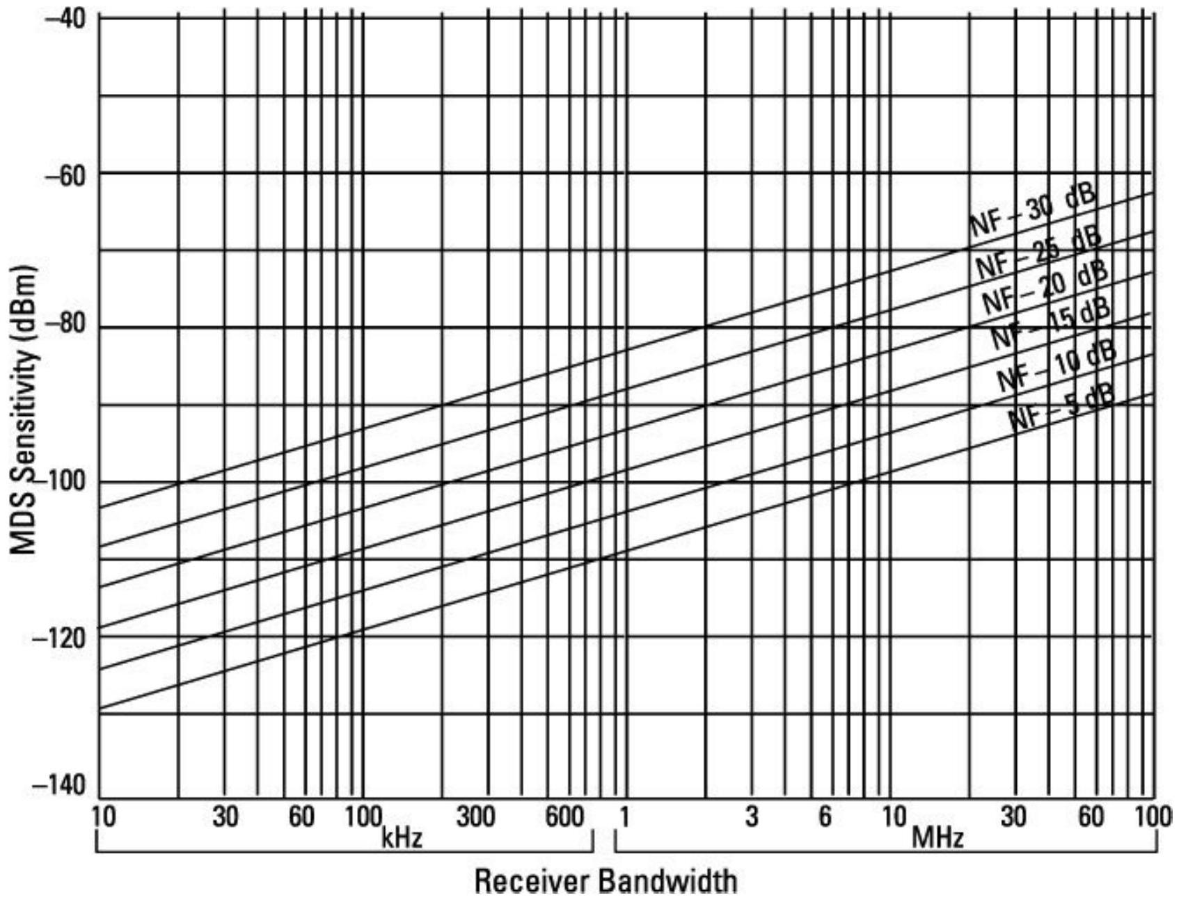 这是定义接收机接收到足够功率以获得所需输出质量信号的接收功率。灵敏度也可以用最小可识别信号(MDS)表示,其计算方法与上述相同,但 RFSNR 为 0 dB(即接收机系统输入端信号等于噪声)。