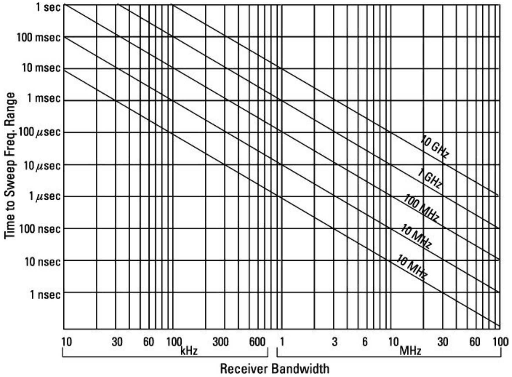 图 11.11 的图表允许根据带宽和待扫描范围确定覆盖给定频率范围所需的时间(在带宽内有足够的驻留时间)。使用方法:从横轴上的接收机带宽向上延伸到待扫描的频率范围,再向左延伸到找到信号所需的总时间。