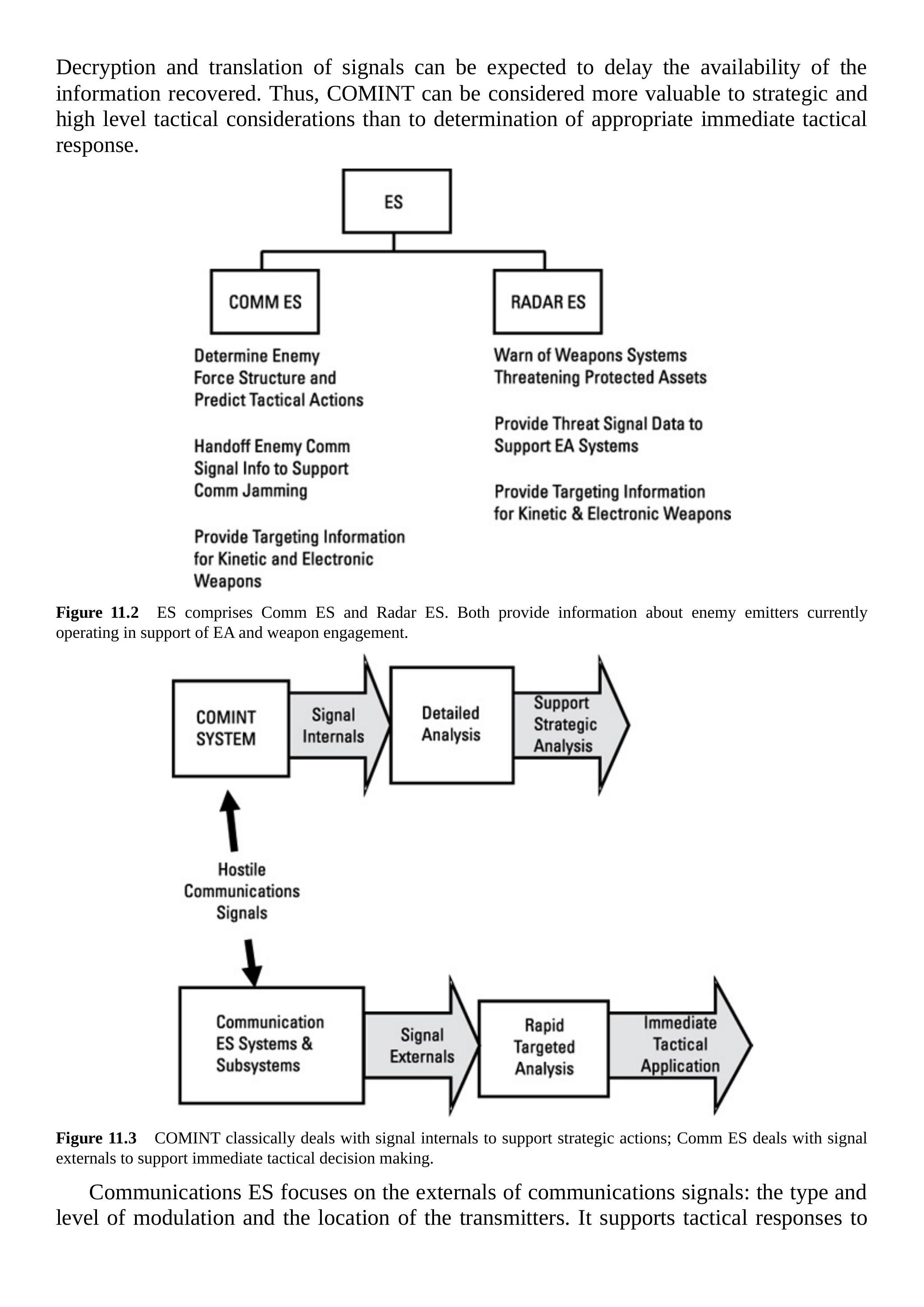 图 11.2 ES 包括通信 ES 和雷达 ES,两者都提供关于当前敌方发射源的情报,以支持电子作战和武器交战。