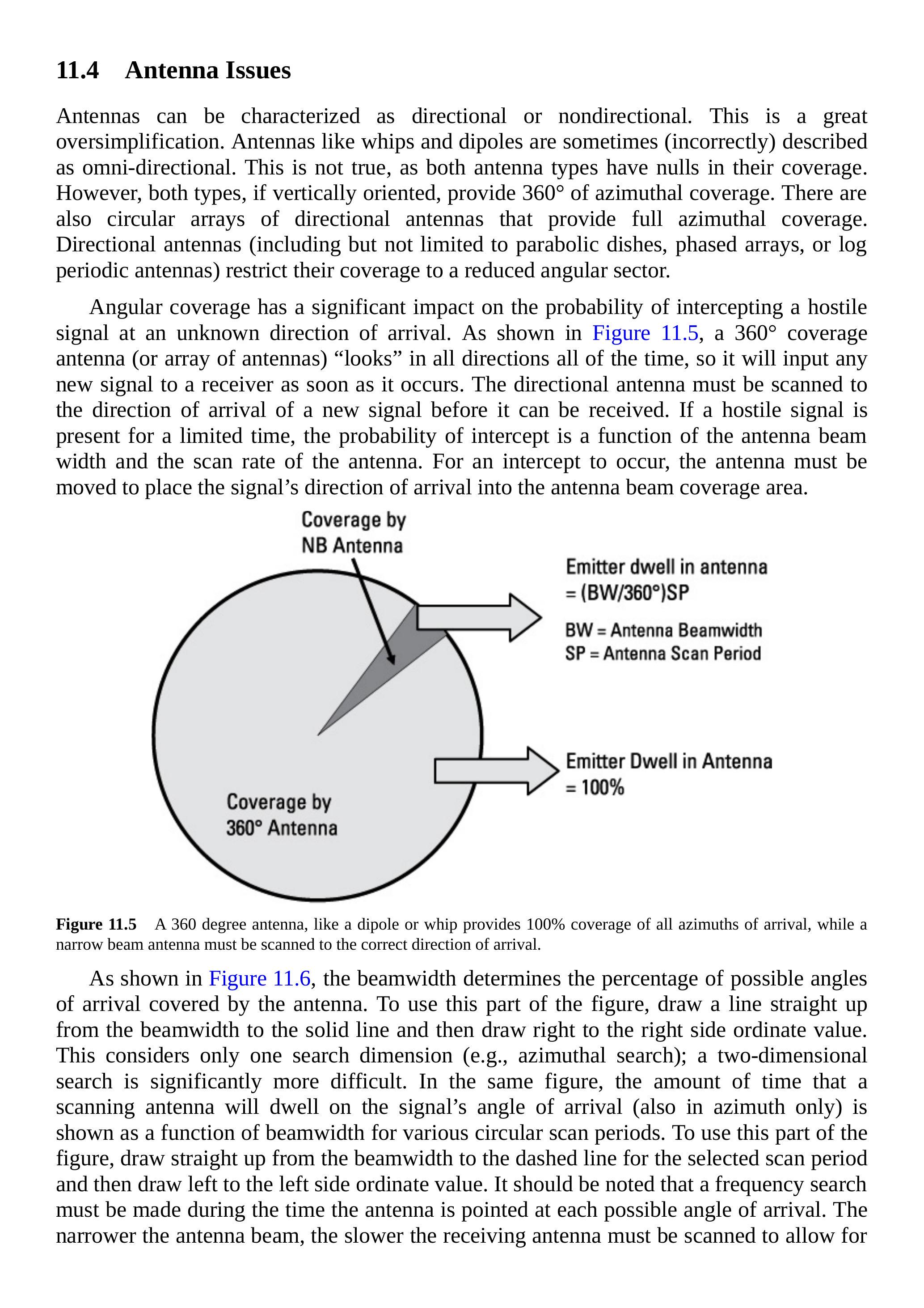 角度覆盖对拦截未知入射方向的敌方信号的概率有显著影响。如图 11.5 所示,\(360^{\circ}\) 覆盖天线(或天线阵列)能够随时“观察”所有方向,因此能在信号出现时立即输入到接收机。定向天线必须扫描到新信号的到达方向才能接收。如果敌方信号存在的时间有限,拦截概率将取决于天线的波束宽度和扫描速率。为了发生拦截,天线必须移动,将信号的入射方向置于天线波束覆盖区域内。