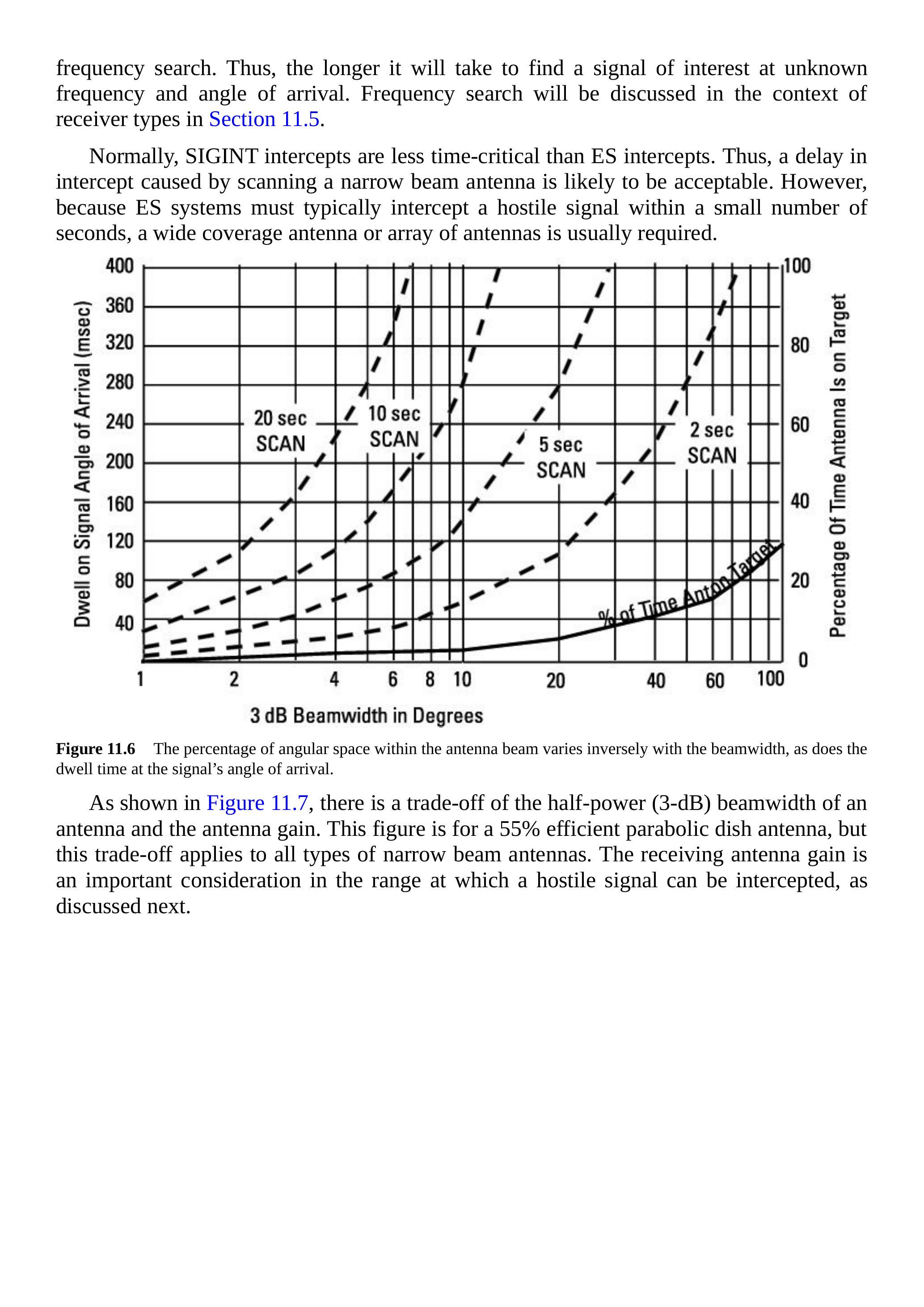 如图 11.6 所示,波束宽度决定了天线覆盖的可能入射角百分比。使用图中的这部分时,从波束宽度向上画一条直线到实线,然后向右画到右侧纵坐标值。这只考虑了一个搜索维度(例如方位搜索);二维搜索则要困难得多。在同一图中,扫描天线在信号入射角(仅方位)上的停留时间显示为各种圆形扫描周期下的波束宽度函数。使用图中这部分时,从波束宽度向上画直线到所选扫描周期的虚线,再向左画到左侧纵坐标值。需要注意的是,在天线指向每个可能入射角期间,必须进行频率搜索。天线波束越窄,为允许频率搜索,接收天线的扫描速度就必须越慢。因此,寻找未知频率和入射角的感兴趣信号所需的时间会更长。频率搜索将在第 11.5 节的接收机类型上下文中讨论。