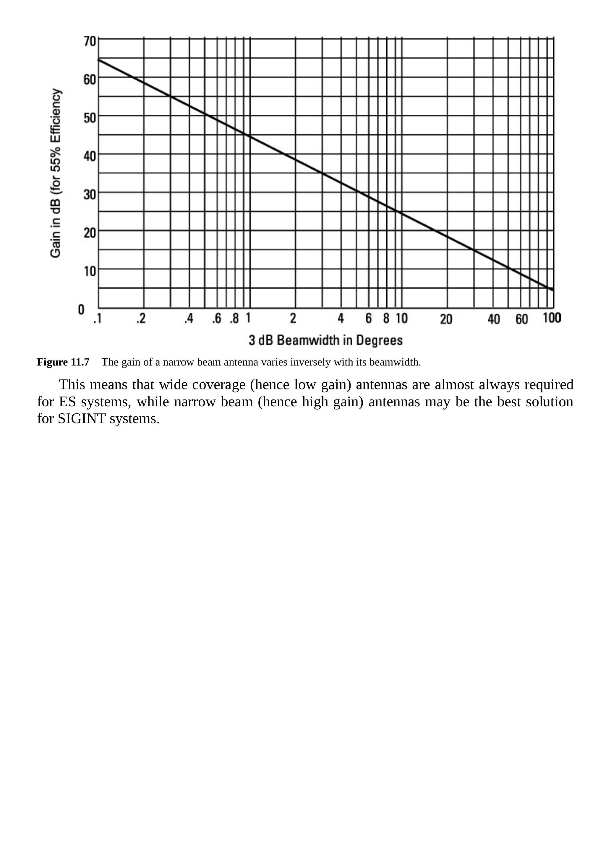 如图 11.7 所示,天线半功率(\(3-\mathrm{dB}\))波束宽度与天线增益之间存在权衡关系。此图针对 \(55\%\) 效率的抛物面天线,但这种权衡适用于所有类型的窄波束天线。接收天线增益是拦截敌方信号距离的重要考虑因素,如下文所述。