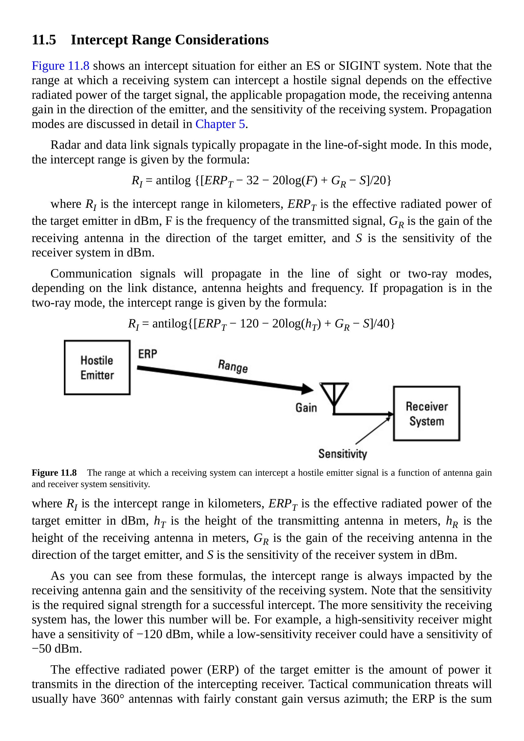 图 11.8 显示了 ES 或 SIGINT 系统的拦截情况。注意,接收系统能够拦截敌方信号的距离取决于目标信号的有效辐射功率、适用的传播模式、接收天线在发射方向上的增益以及接收系统的灵敏度。传播模式在第 5 章中有详细讨论。