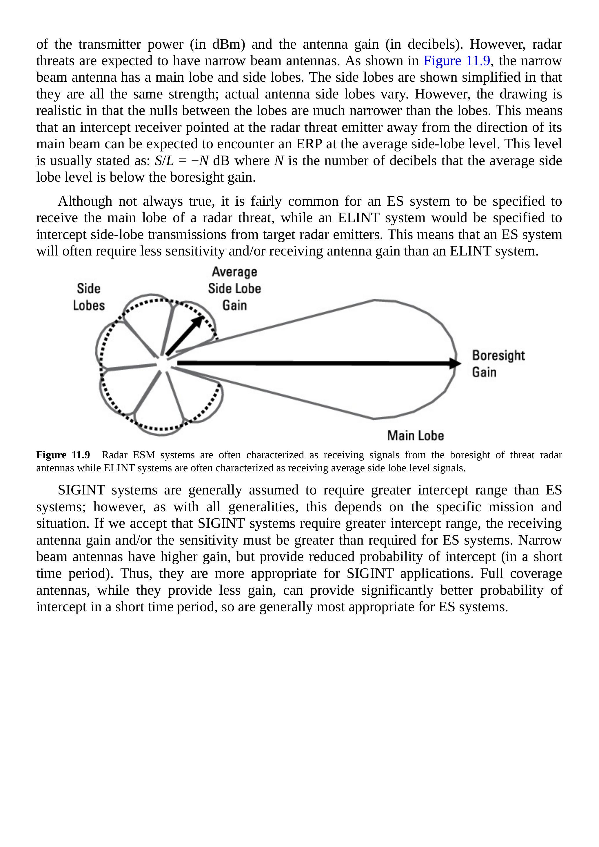 图 11.9 雷达 ESM 系统通常被描述为接收威胁雷达天线的轴向信号,而 ELINT 系统通常被描述为接收平均旁瓣电平信号。