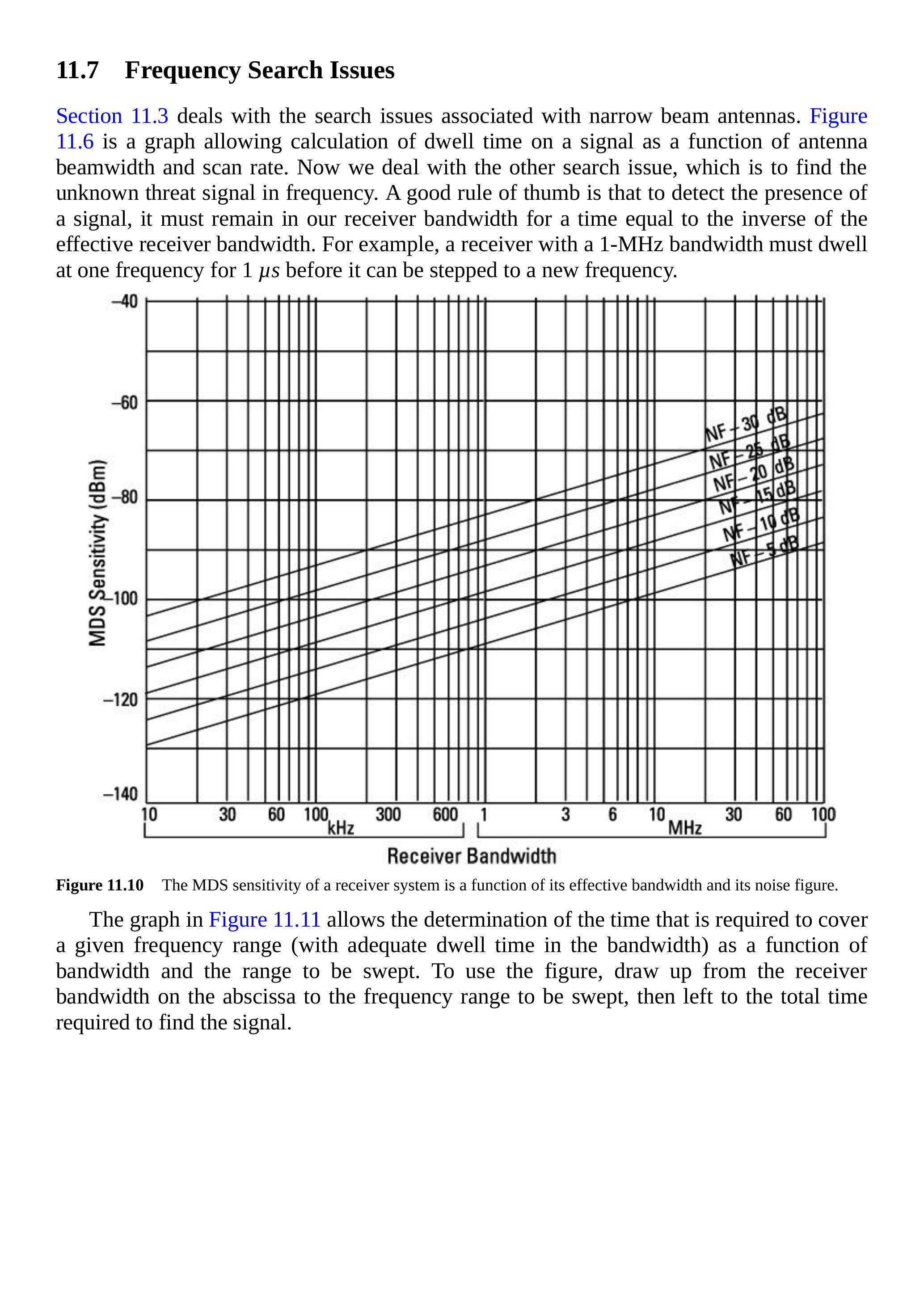 图 11.11 的图表允许根据带宽和待扫描范围确定覆盖给定频率范围所需的时间(在带宽内有足够的驻留时间)。使用方法:从横轴上的接收机带宽向上延伸到待扫描的频率范围,再向左延伸到找到信号所需的总时间。