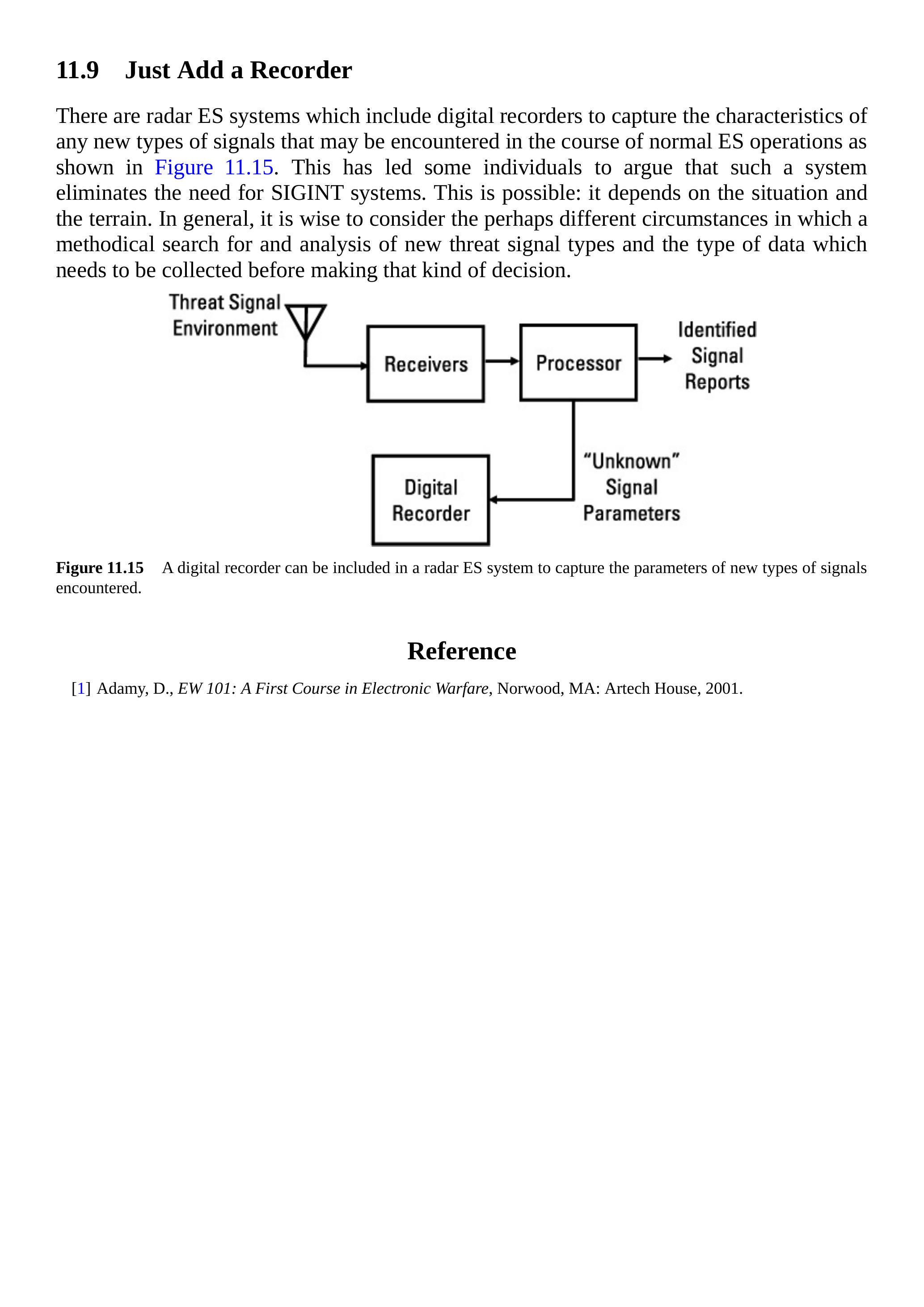 有些雷达 ES 系统包含数字记录器,用于捕获在正常 ES 操作过程中可能遇到的任何新型信号特性,如图 11.15 所示。这使得一些人认为这样的系统可以消除对 SIGINT 系统的需求。这在某些情况下是可能的:取决于具体的情境和地形。一般而言,在做出这种判断之前,明智的做法是考虑系统性搜索和分析新型威胁信号类型的不同环境,以及需要收集的数据类型。