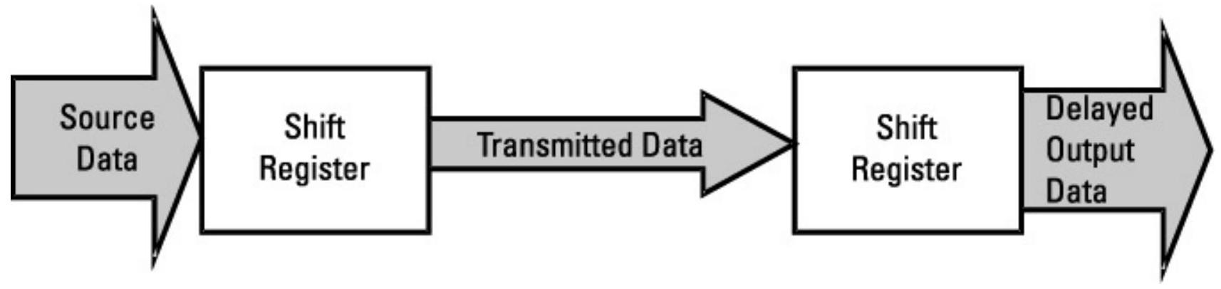 如图2.6所示,在信息输入点的带宽必须足以接收该数据。然而,传输带宽可能不同。如果数据流必须连续,则传输路径必须具备完整的输入数据带宽。然而,如果输入数据不是连续的,或者数据流速率可变,就可以用较低速率传输。实际系统通常会将数据数字化,并在链路发送端存入寄存器。然后以较低速率从寄存器输出数据,从而缩小传输带宽。在接收端,数据可以(如果需要)输入另一个寄存器,并以原始速率输出。影响所需传输带宽的还有两个因素:时延和吞吐率。