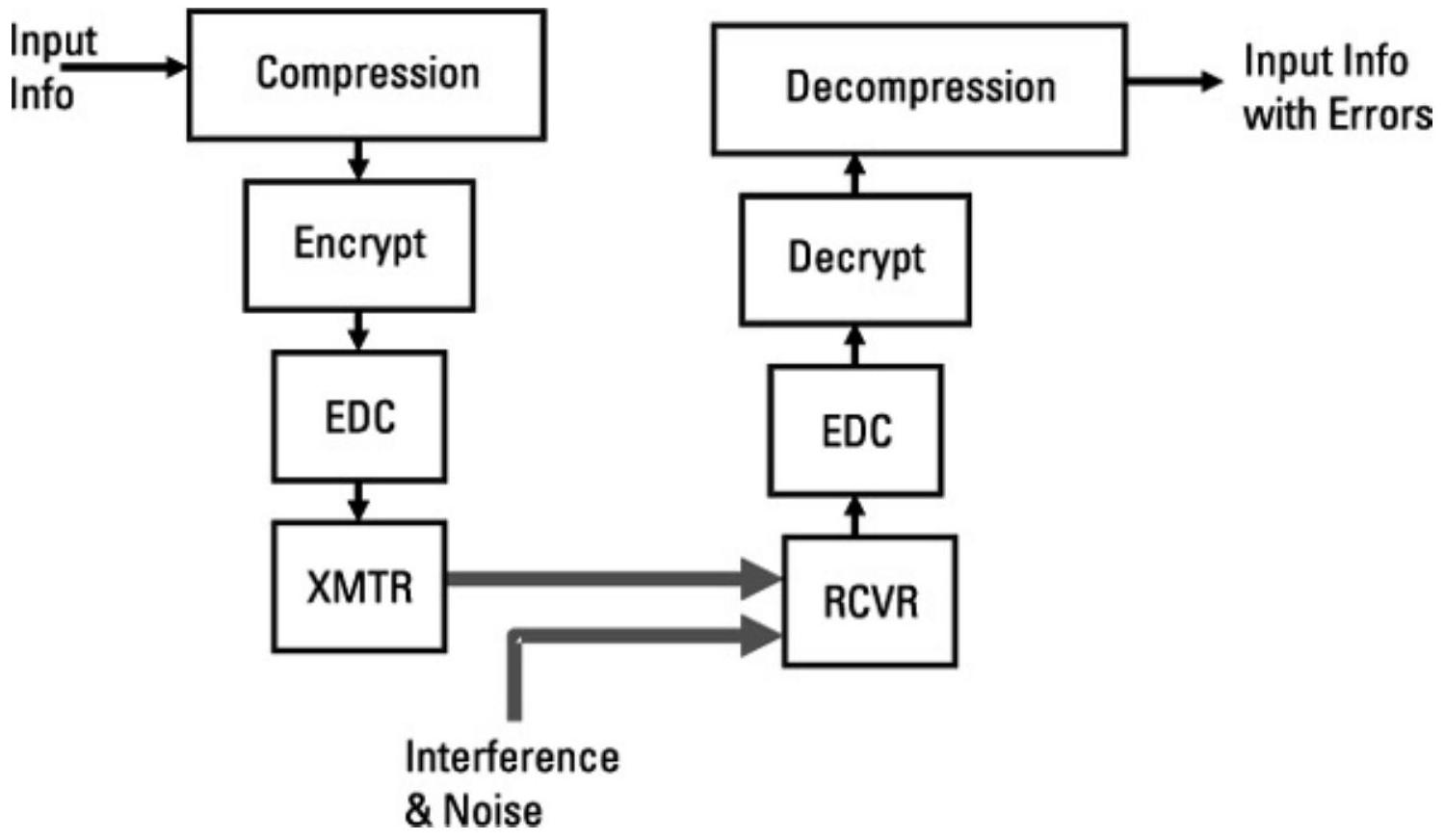 图2.9 信息流以压缩为首要功能。在加密与解密之间执行EDC,以便在解密与最终解压缩之前尽可能消除错误。
