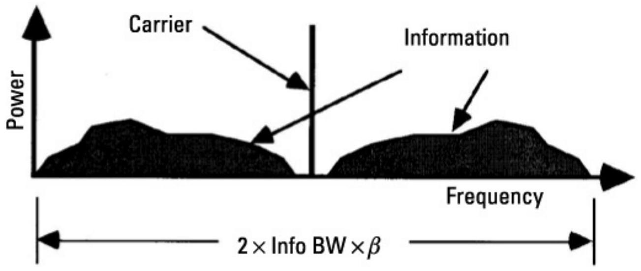 其中,SNR为输出信噪比(分贝),RFSNR为检测前信噪比(分贝)。为了实现这种SNR改善,RFSNR必须高于阈值:4 dB或12 dB,具体取决于接收机中使用的解调器类型。对于商用FM广播信号,最大调制频率为15 kHz,调制指数为5。常见类型解调器的RFSNR阈值为12 dB。因此,广播带宽为150 kHz (即\(2 \times 15 \mathrm{kHz} \times 5\))。在接收天线的最小阈值信号条件下,输出SNR为31 dB (即\(12+5+20 \log 5=12+5+14\))。频率调制改善了19 dB的输出SNR。