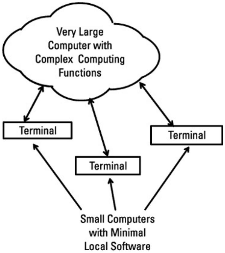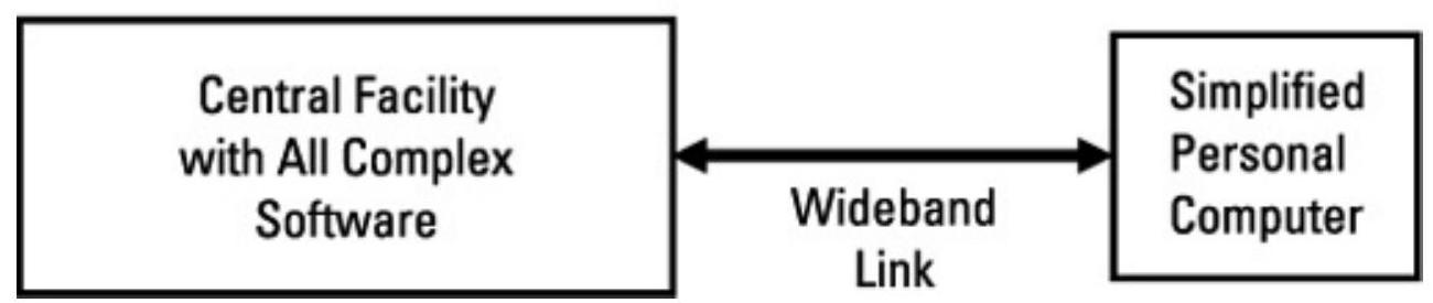 图2.34 云计算将大部分软件转移到由数据链路访问的大规模中央计算设施。