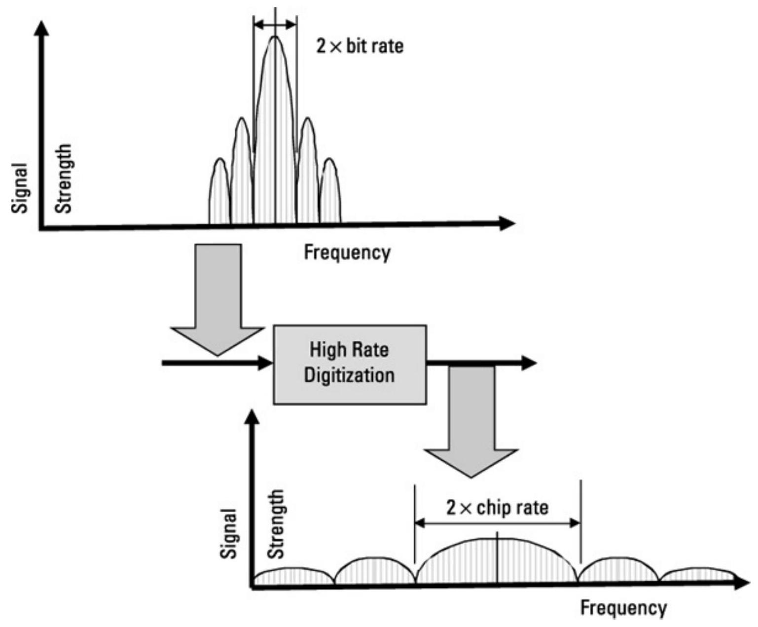 通常,这类信号的传输频谱远大于承载所需信息的频谱。接收机的解扩操作能够恢复传输的信息,同时提供处理增益,提高恢复信息与接收到的干扰误输出之间的比值。需要注意的是,这些系统都是通过增加传输带宽来换取噪声/干扰抑制效果。一个简单的理解方式是参考商用调频(FM)广播信号。