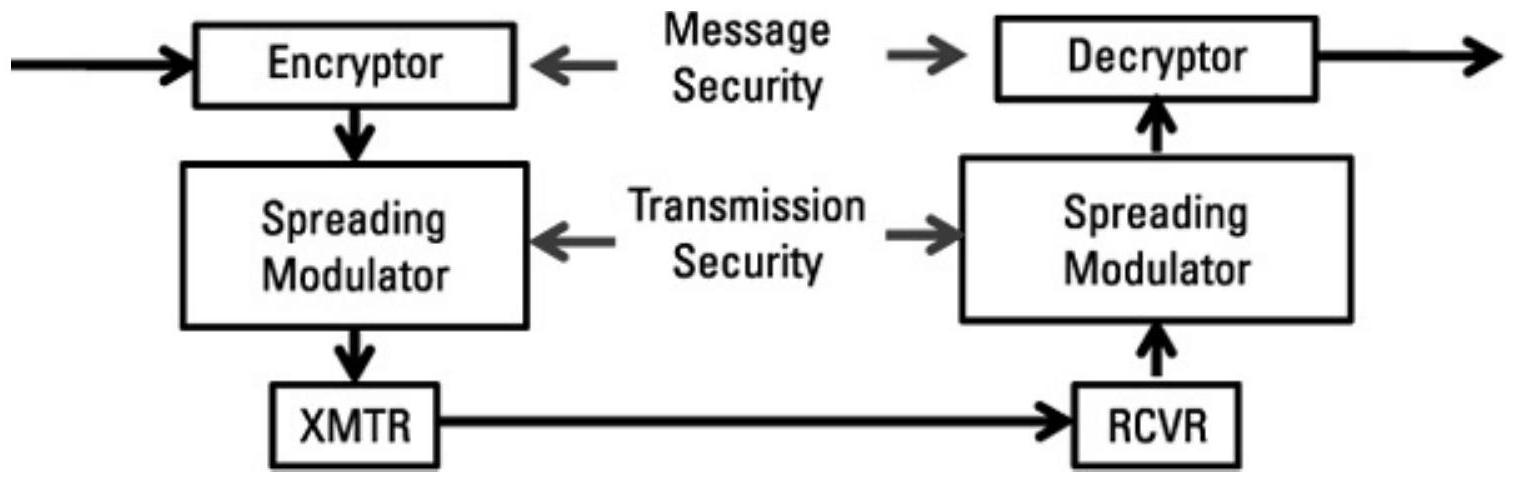 图2.36 扩频通信提供传输安全,而加密提供信息安全。