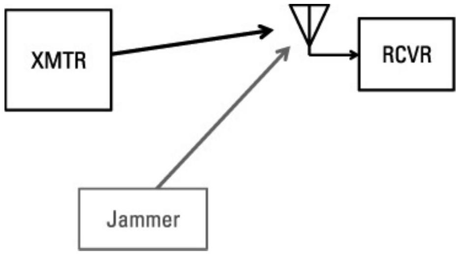 - 干扰的对象是接收机,而不是发射机。任何干扰都是让不希望出现的信号以足够的功率进入目标接收机,从而使其无法正确恢复正在试图接收的信息(见图2.40)。