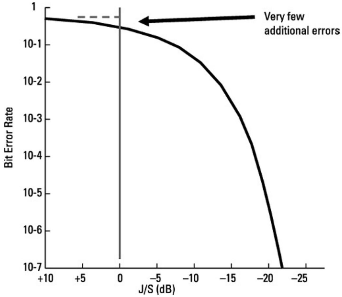 - 对于数字信号而言,0 dB的J/S就足够了,通常\(20\%\)到\(33\%\)的干扰占空比即可阻断所有通信。使数字信号无法恢复的最可靠方式是制造足够高的比特错误率(即恢复错误的比特百分比)。