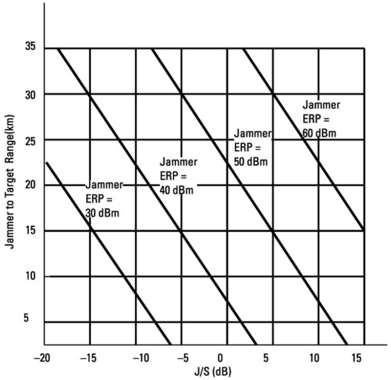 扩频、天线方向性和/或纠错技术的效果是降低干扰效率。对于数字信号的有效干扰,我们希望实现\(0 \,\mathrm{dB}\, J/S\),但这是考虑了各种抗干扰技术后的有效J/S。这意味着必须向目标接收机传递更多的干扰功率。提高接收干扰功率有两种基本方式:增加干扰机的ERP,或让干扰机更靠近目标接收机。图2.44展示了这两个变量对某一特定敌方链路J/S的影响。目标链路的期望发射机ERP为\(100 \,\mathrm{W}(+50 \,\mathrm{dBm})\),作用距离为20 km。图中的每条曲线对应不同的干扰机ERP。使用该图时,从干扰机到目标的距离出发,向右找到对应ERP曲线,再向下读出所达到的J/S。例如,若干扰机到目标距离为15 km,干扰机ERP为\(40 \,\mathrm{dBm}(10 \,\mathrm{W})\),则达到的J/S为-5 dB。该图明显表明“前置干扰”(stand-in jamming)的效果,即将干扰机移近目标接收机时的优势。