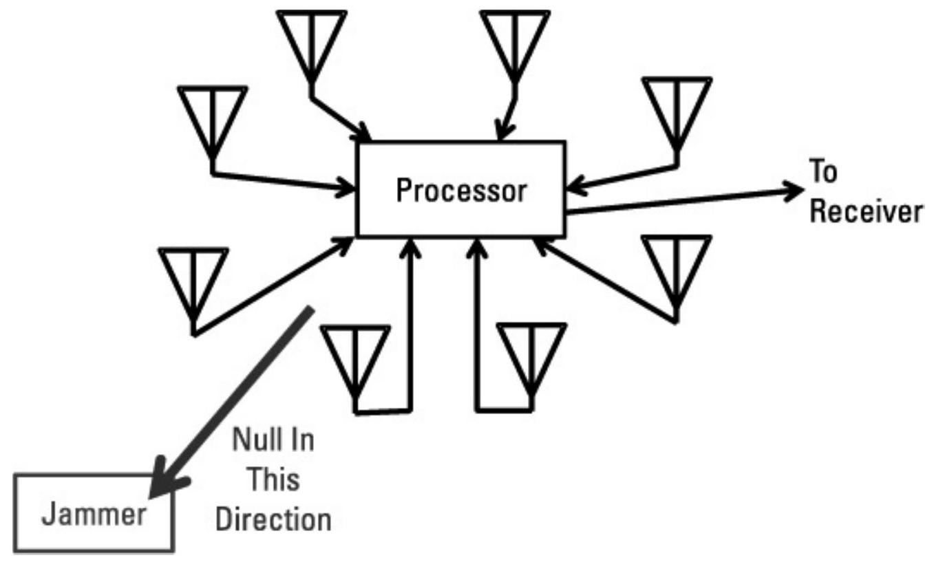 图2.43展示了一个零陷天线阵。此类阵列中的天线波束宽,通常覆盖\(360^\circ\)。处理器在各天线馈线中施加相位移,从而在选定方向形成窄波束。相位移也可调整为在一个或多个方向形成零陷。如果零陷指向干扰机,等效干扰功率会因零陷深度而降低,相应减少J/S。