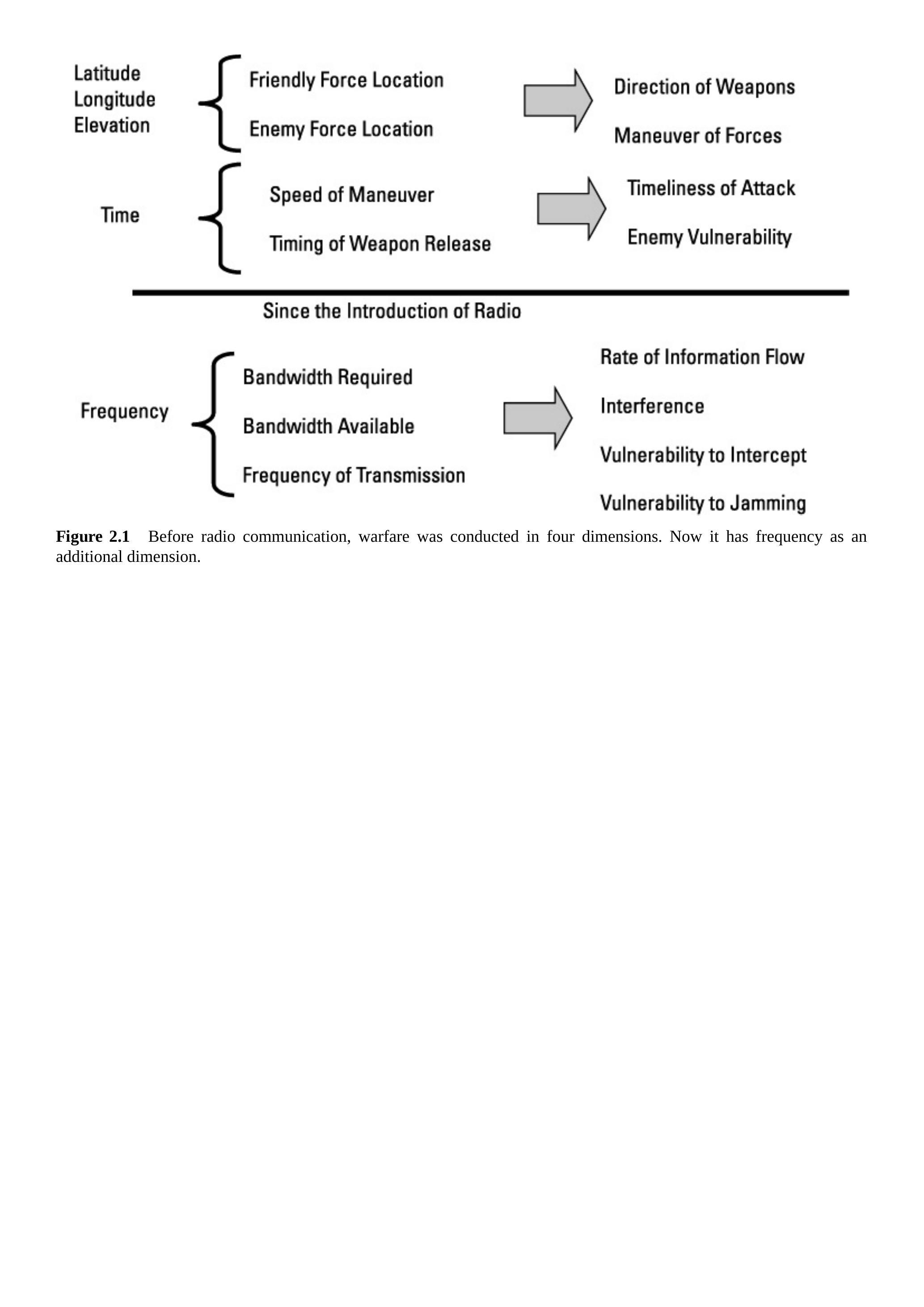 图2.1 在无线电通信出现之前,战争是在四个维度中进行的。现在增加了一个维度:频率。