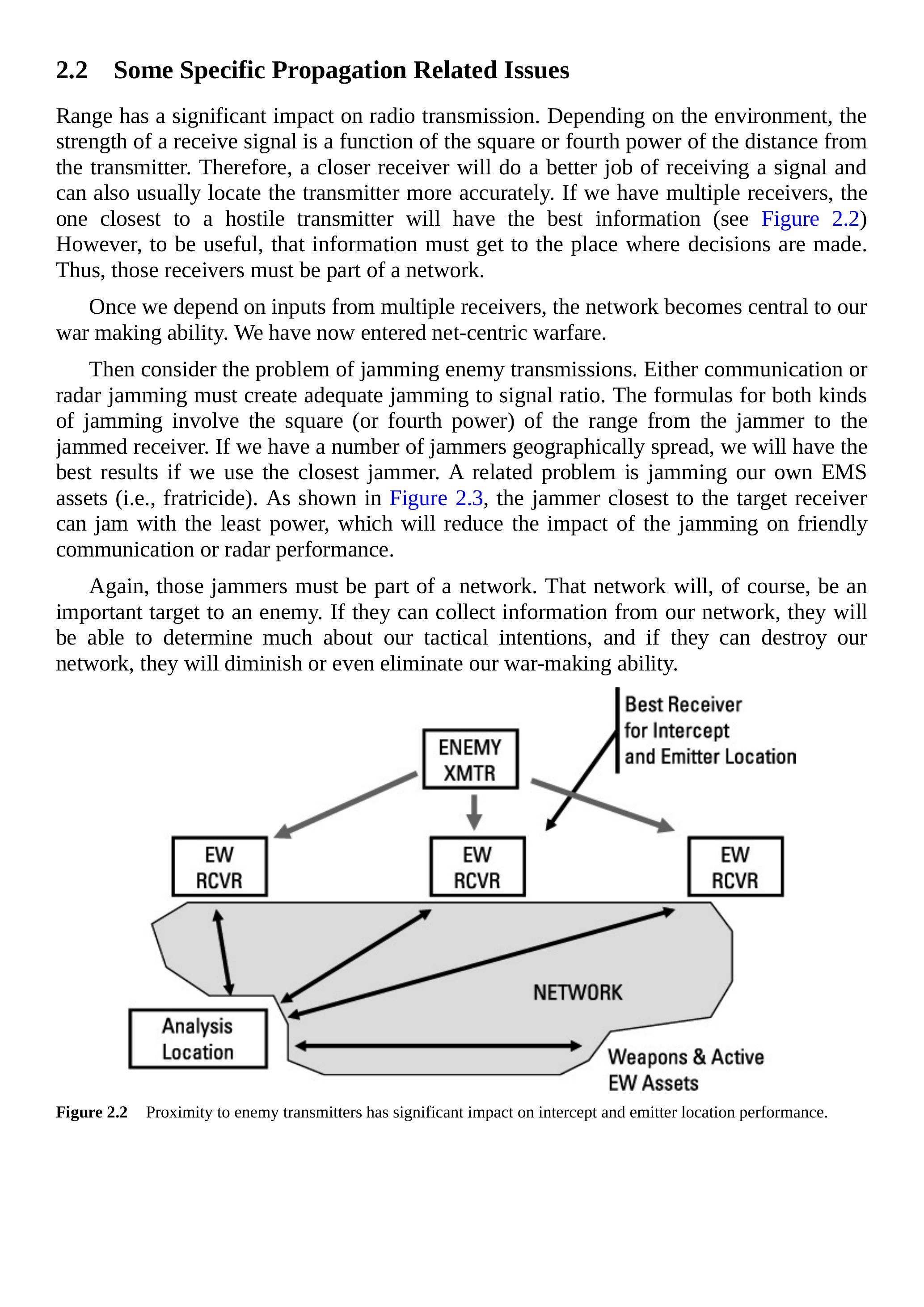 距离对无线电传输有显著影响。根据环境不同,接收信号的强度是发射机距离的平方或四次方的函数。因此,越近的接收机越能更好地接收信号,并且通常也能更准确地定位发射机。如果我们有多个接收机,那么距离敌方发射机最近的接收机会获得最佳信息(见图2.2)。然而,要使这些信息有用,它们必须传递到决策点。因此,这些接收机必须是网络的一部分。