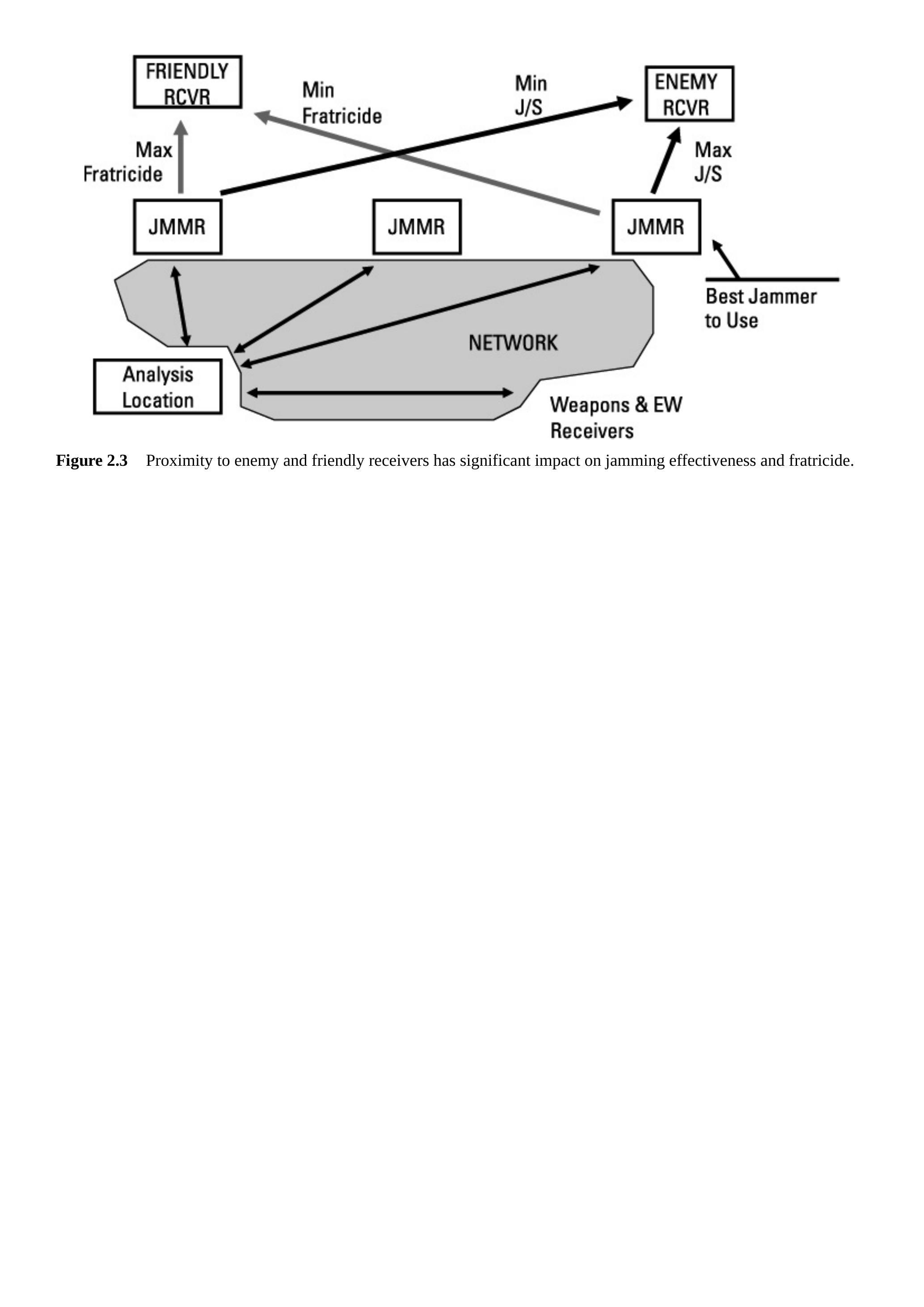 再考虑干扰敌方传输的问题。无论是通信干扰还是雷达干扰,都必须产生足够的干扰与信号比(J/S)。这两类干扰的公式都涉及干扰机与被干扰接收机之间距离的平方(或四次方)。如果我们有地理分布的多个干扰机,最优方案是使用距离最近的干扰机。一个相关问题是干扰到我们自己的电磁频谱(EMS)资产(即误伤友军)。如图2.3所示,距离目标接收机最近的干扰机可以用最小功率实现干扰,从而减少对友方通信或雷达性能的影响。