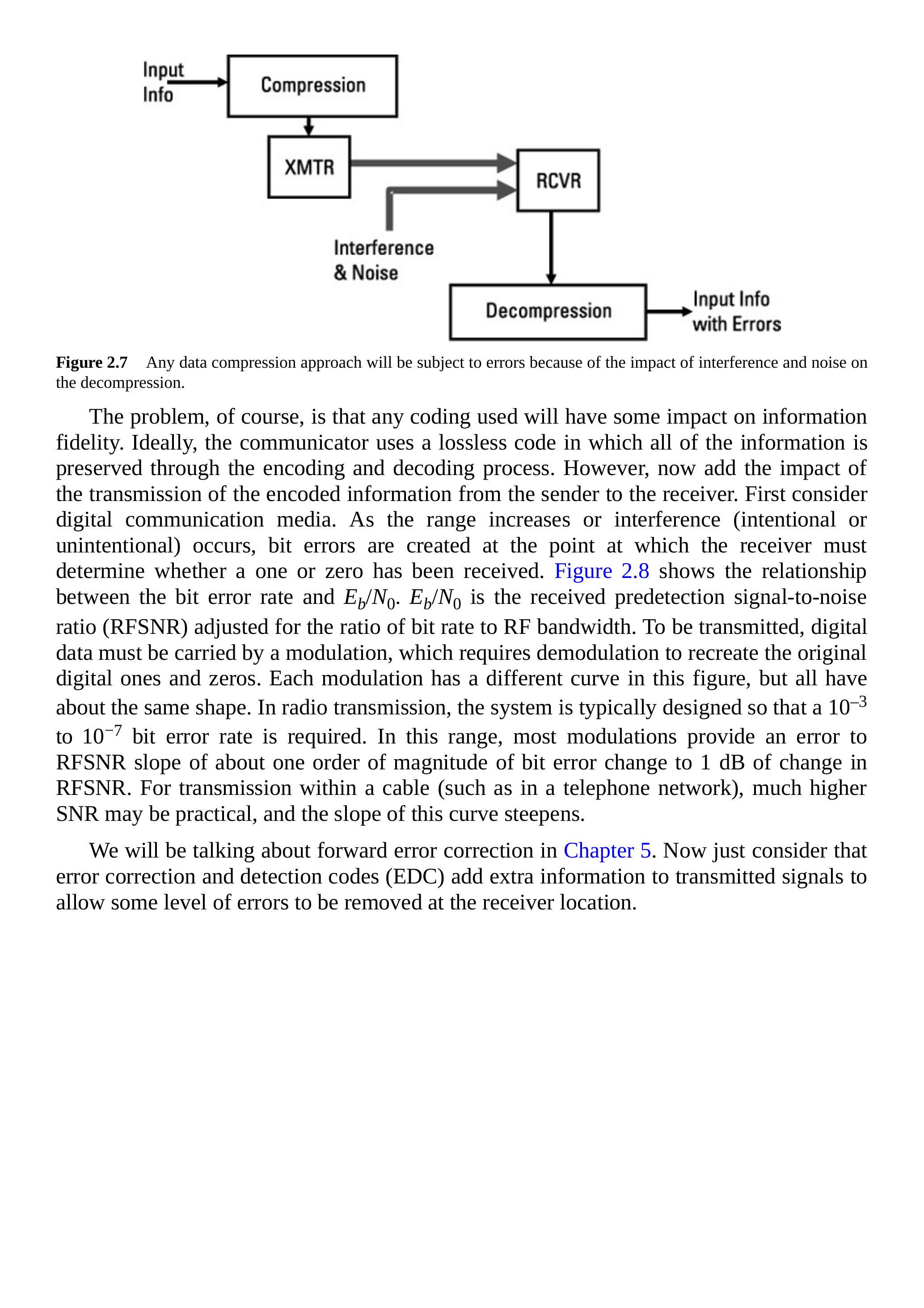 这里要强调的一点是,比特错误几乎总会存在。这些比特错误会降低传输信息的准确性,因为编码到信息基本形式的转换受到影响。例如,当使用视频压缩时,每一个比特错误都会降低重建图像的质量。