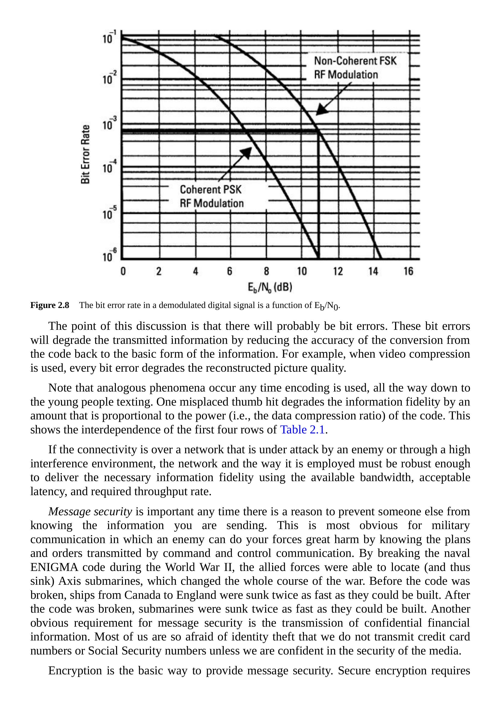 加密是提供信息安全的基本方法。安全加密要求信息是数字形式,并且在消息中添加一串随机比特(\(1+1=0\)等)。在接收端,通过添加同样的随机比特序列来恢复原始消息。这通常不需要增加带宽或降低吞吐率。然而,当存在比特错误时,一些加密系统会导致比特错误率增加。某个系统(多年前)经过仔细测量后发现,使用加密时比特错误率增加了两个数量级(即解密器将一个错误放大为100个错误)。根据图2.8,要保持足够的信息保真度,需要增加2 dB的接收信号功率。