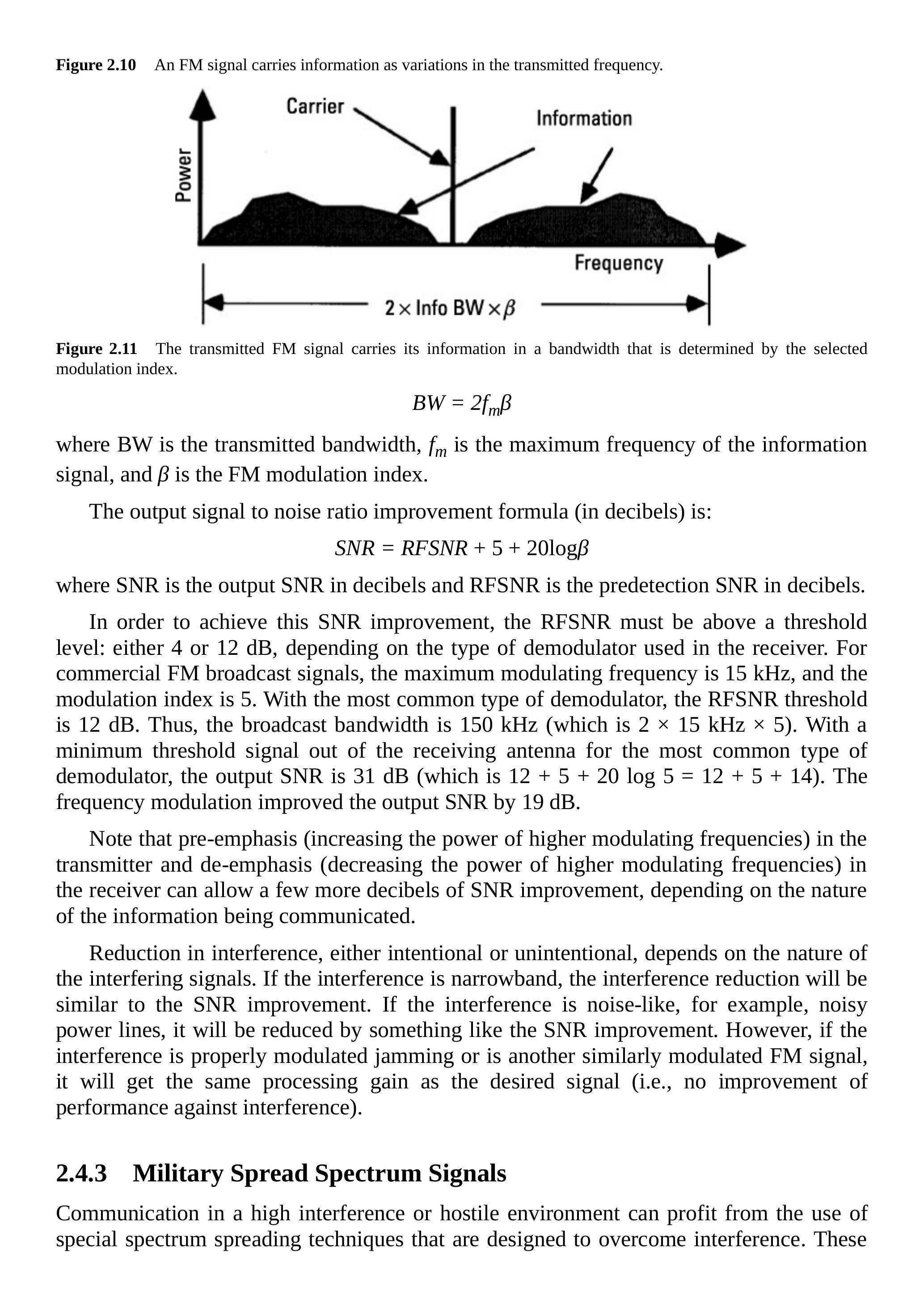 其中,SNR为输出信噪比(分贝),RFSNR为检测前信噪比(分贝)。为了实现这种SNR改善,RFSNR必须高于阈值:4 dB或12 dB,具体取决于接收机中使用的解调器类型。对于商用FM广播信号,最大调制频率为15 kHz,调制指数为5。常见类型解调器的RFSNR阈值为12 dB。因此,广播带宽为150 kHz (即\(2 \times 15 \mathrm{kHz} \times 5\))。在接收天线的最小阈值信号条件下,输出SNR为31 dB (即\(12+5+20 \log 5=12+5+14\))。频率调制改善了19 dB的输出SNR。