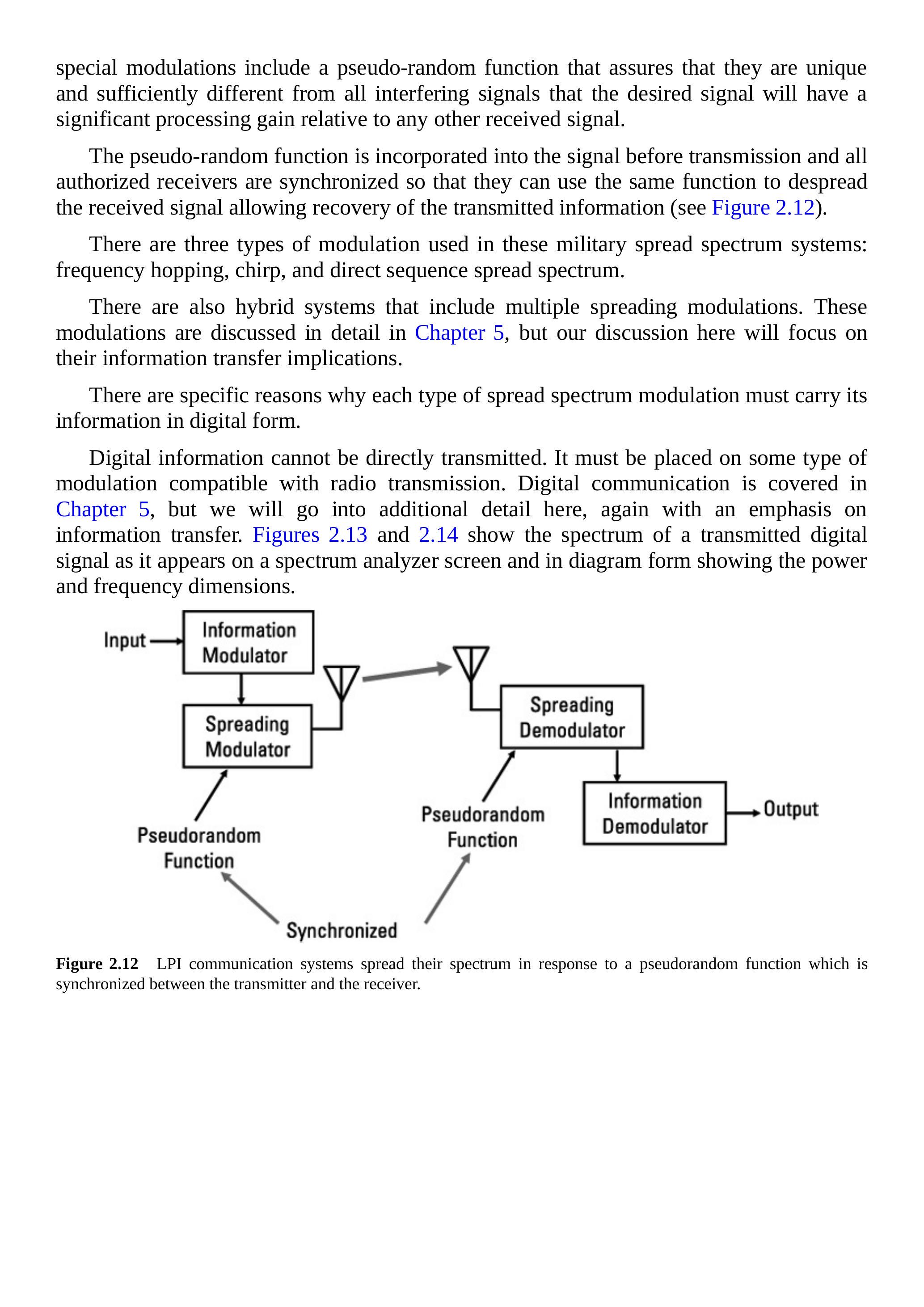 伪随机函数在传输前被嵌入信号中,所有授权接收机都保持同步,以便使用相同的函数对接收信号进行解扩,从而恢复传输的信息(见图2.12)。