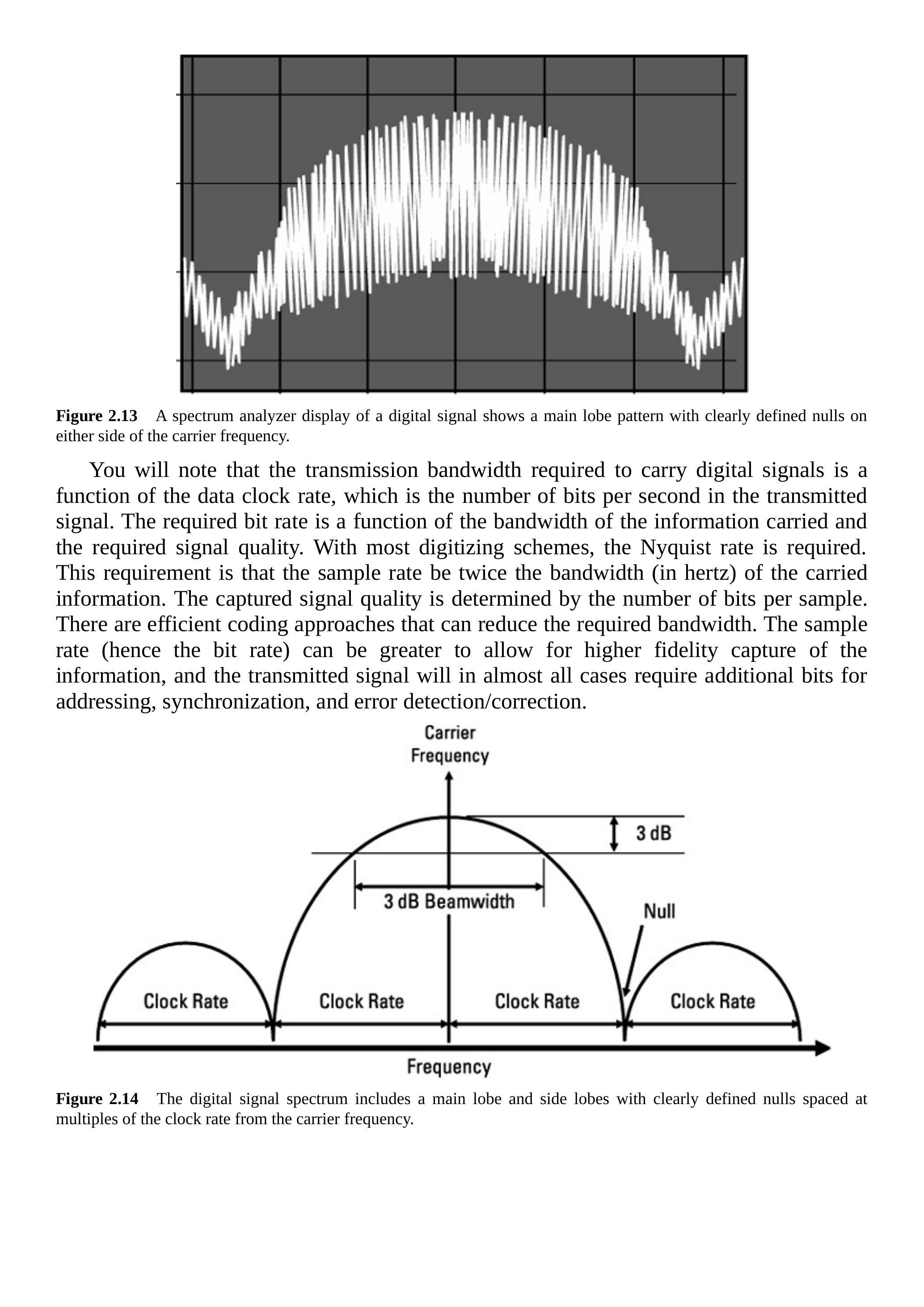数字信息不能直接传输,必须加载到某种适用于无线电传输的调制方式中。数字通信将在第5章讨论,这里我们会补充更多细节,重点仍是信息传输。图2.13与图2.14分别展示了频谱分析仪屏幕上和图示形式下的数字信号频谱,包括功率与频率维度。