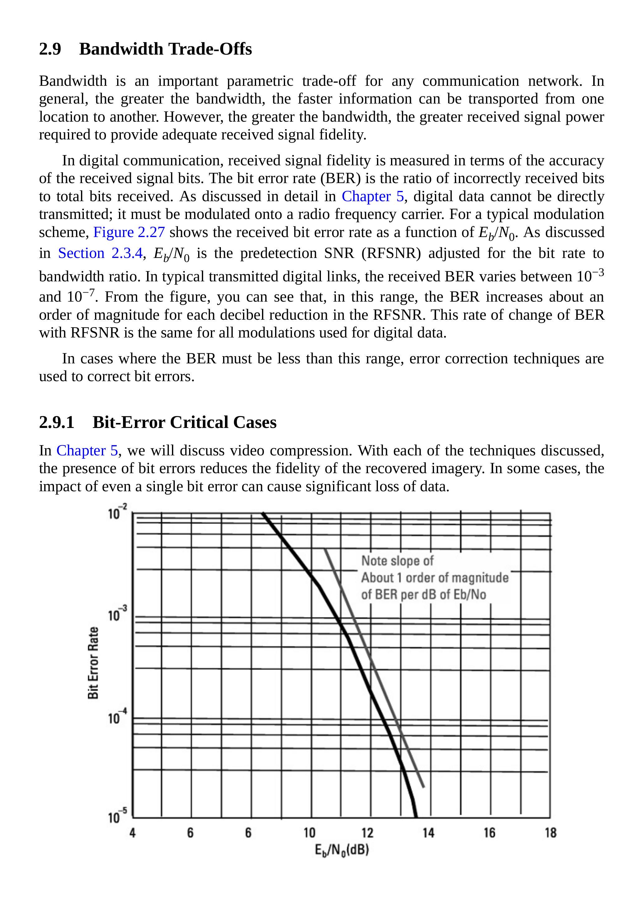 图2.8展示了比特错误率与\(E_b/N_0\)的关系。\(E_b/N_0\)是接收机在判决前的信噪比(RFSNR),并根据比特率与射频带宽之比进行调整。要传输,数字数据必须通过调制方式承载,而解调则用于重建原始数字0与1。不同调制方式在该图中有不同曲线,但形状大致相同。在无线电传输中,系统通常要求比特错误率在\(10^{-3}\)到\(10^{-7}\)之间。在这个范围内,大多数调制方式的曲线斜率约为:RFSNR每变化1 dB,比特错误率就变化一个数量级。在有线传输(如电话网络)中,可能实现更高的信噪比,且曲线更陡峭。